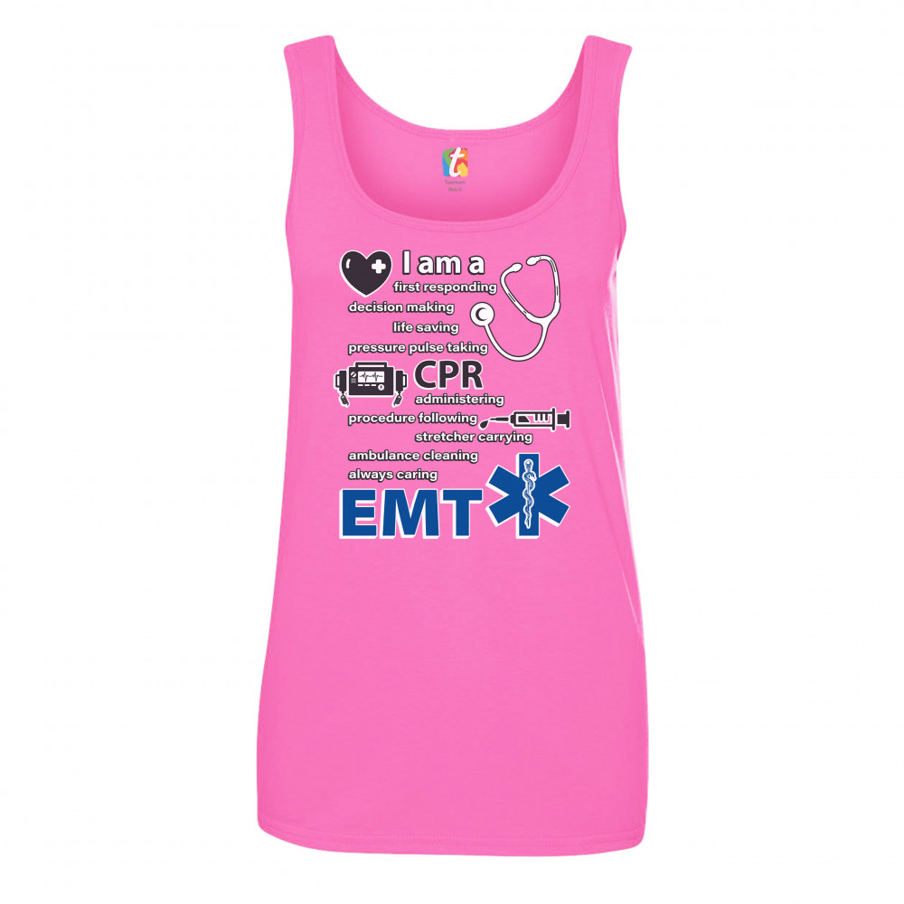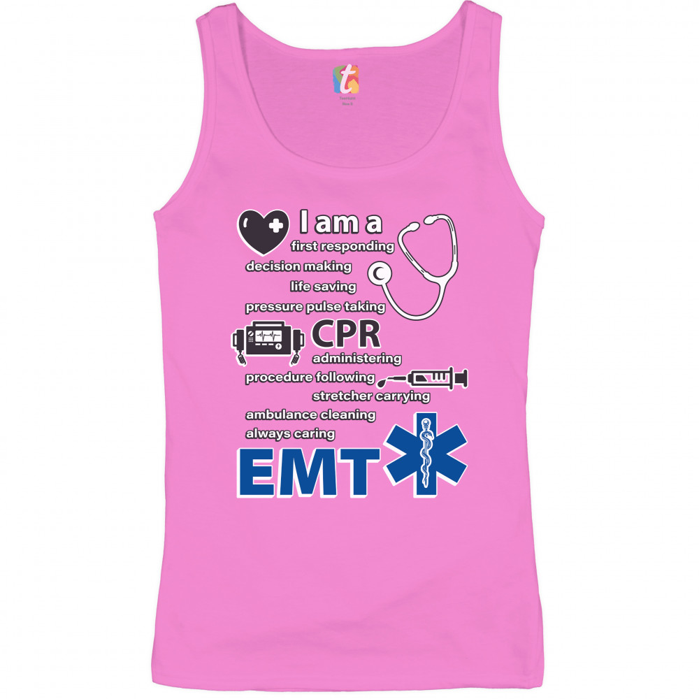 A print saying "I am a first responding, decision making, life saving, pressure pulse taking, CPR administering, procedure following, stretcher carrying, ambulance cleaning, always caring EMT". The print also features images of a heart, a stethoscope, a defibrillator, a syringe and the Star of Life. A great choice as a gift for a first responder.