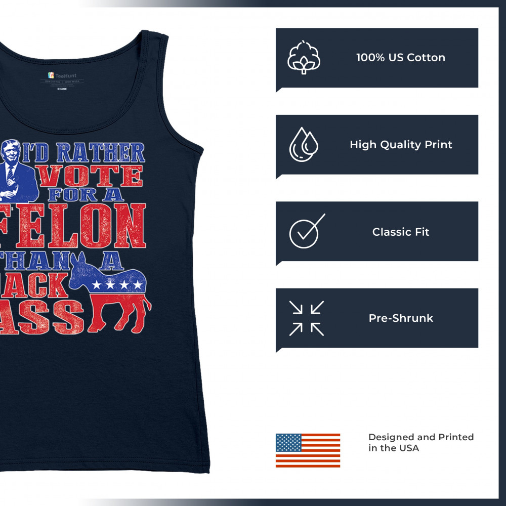 Make a statement with this design, perfect for any Trump supporter. The bold phrase, "I'd Rather Vote For A Felon Than A Jackass," showcases loyalty to Trump and JD Vance, contrasted against the opposition. Ideal for rallies and everyday wear, it highlights patriotic colors and a clear conservative stance. Show your commitment to the values of America First and resist leftist policies. This design is a declaration of your beliefs and a call to Make America Great Again.