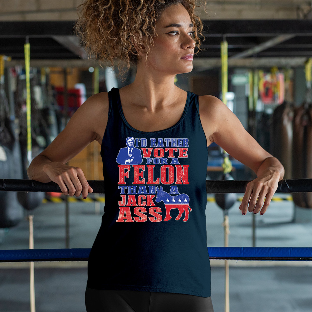 Boldly express your support with the "I'd Rather Vote For A Felon Than A Jackass" design. Perfect for rallies, it showcases loyalty to Trump and JD Vance.