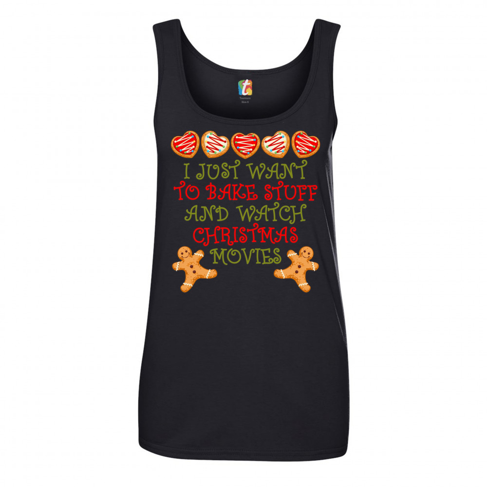 A print saying: "I just want to bake stuff and watch Christmas Movies". The print features two gingerbread men in the bottom and five heart-shaped cookies in the top. Amazing choice to make people smile and spread positive vibes on Christmas Eve.