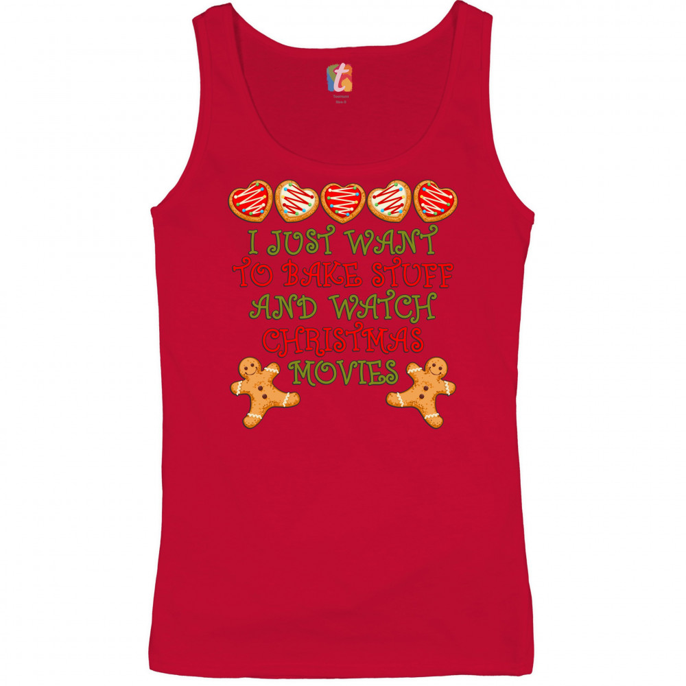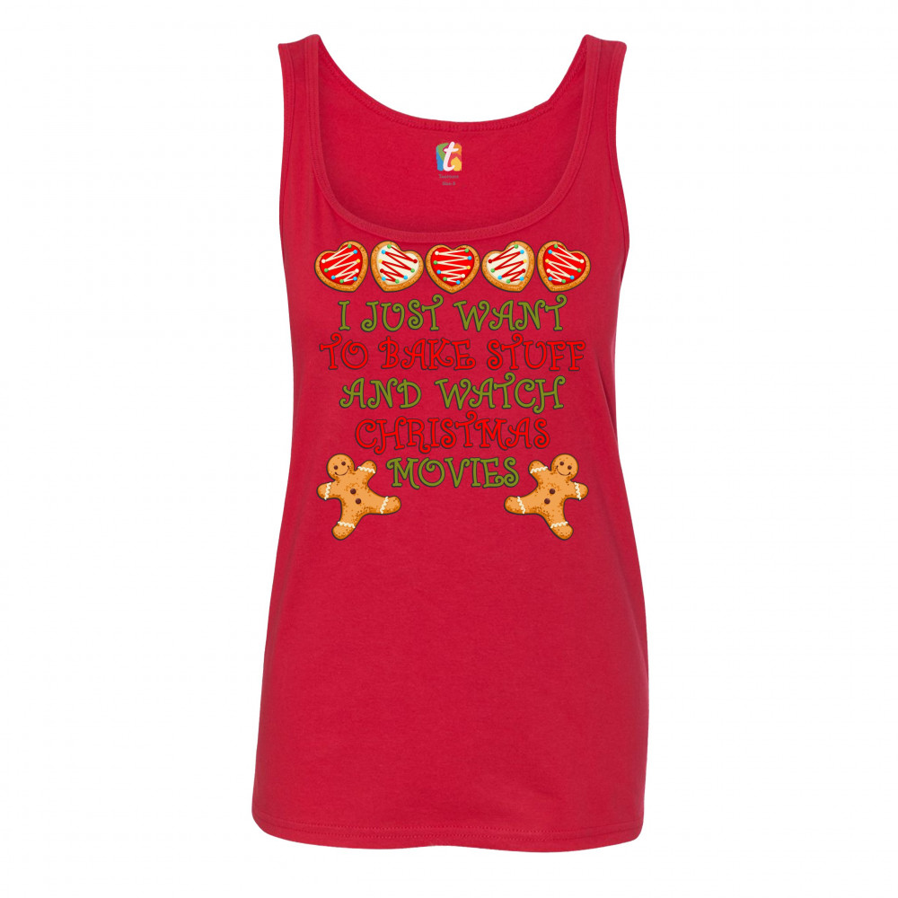 A print saying: "I just want to bake stuff and watch Christmas Movies". The print features two gingerbread men in the bottom and five heart-shaped cookies in the top. Amazing choice to make people smile and spread positive vibes on Christmas Eve.