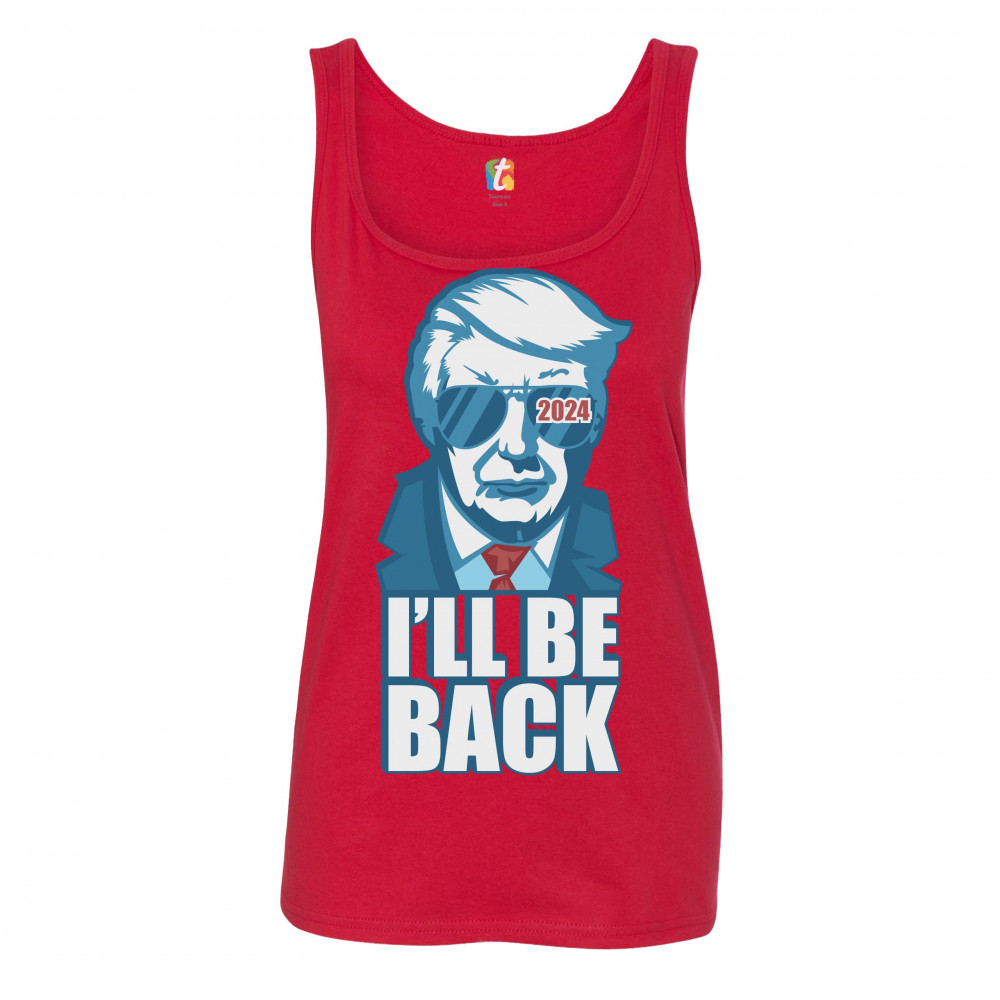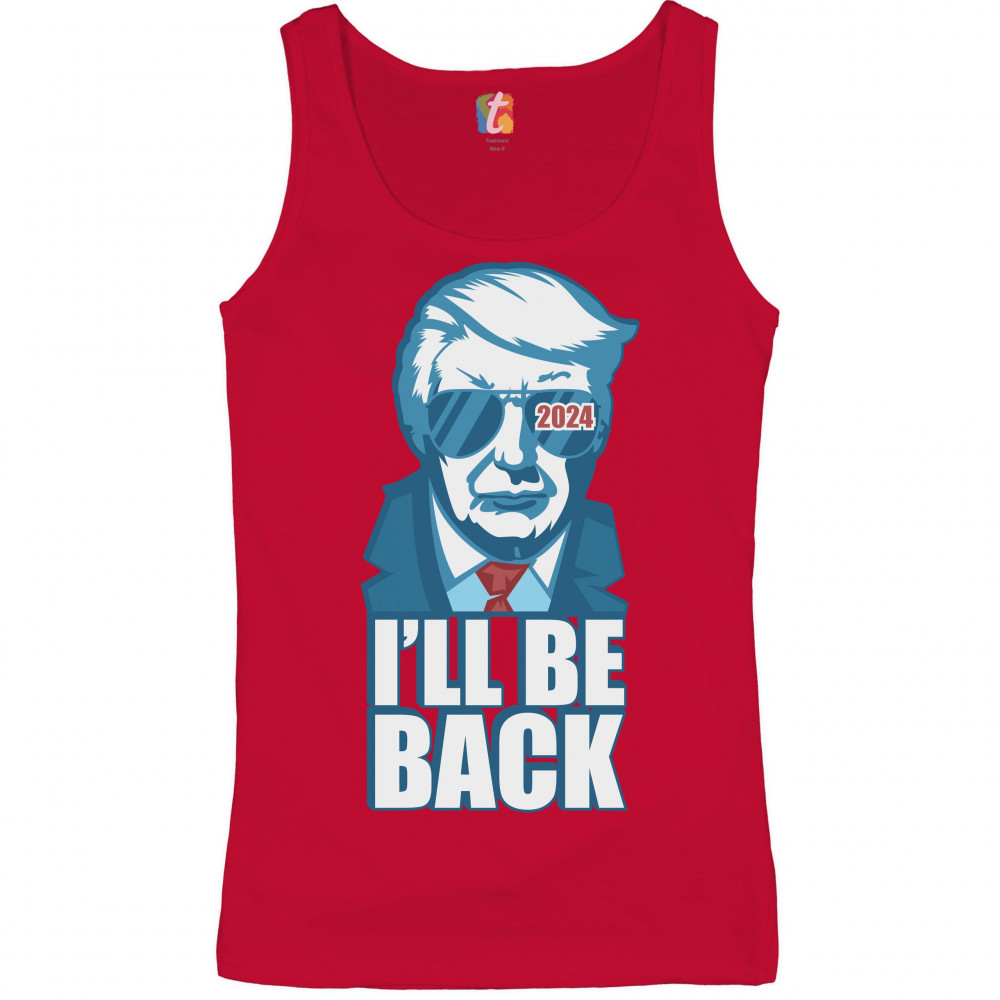 A print saying "I'll Be Back" and featuring the face of Donald Trump wearing glasses, with "2024" inside of one of the lenses. A great choice to wear to a Trump rally or give as a gift to a Donald Trump supporter before 2024 presidential elections.