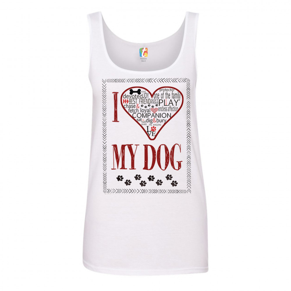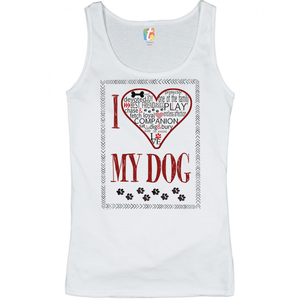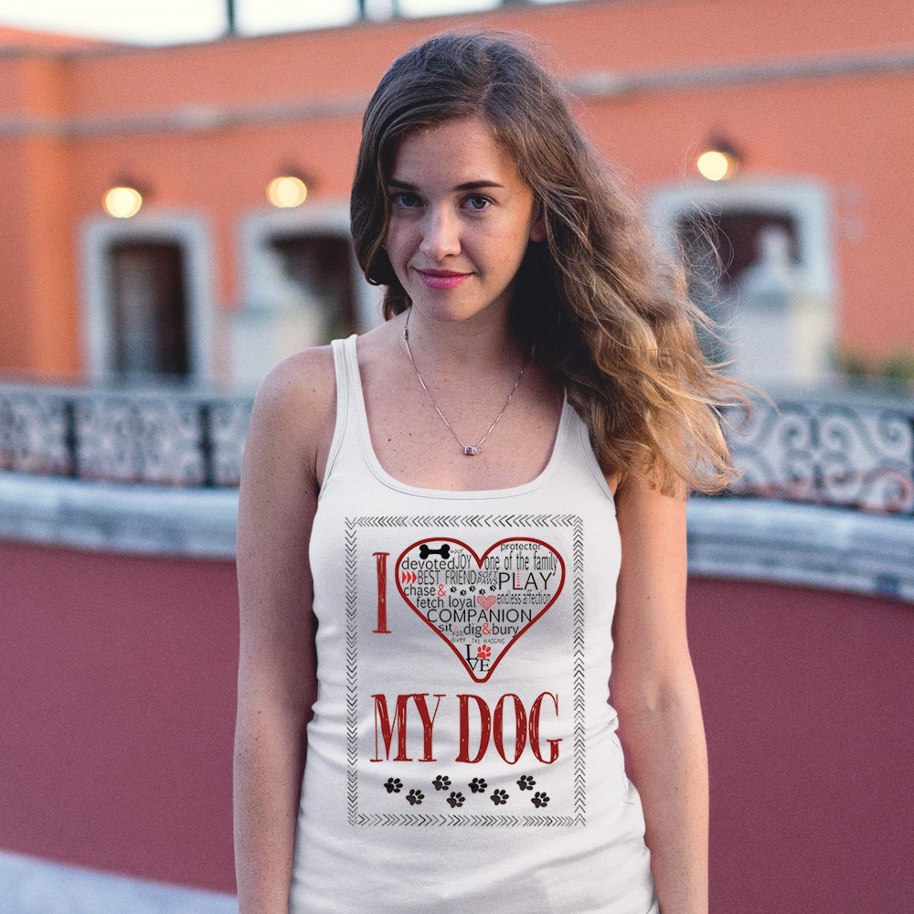 A sweet print featuring a frame inside of which, there are dog tracks and the phrase "I love my dog" in which "love" is replaced with a huge heart. The heart is filled with numerous compliments a beloved dog can be described with. A great choice for any d