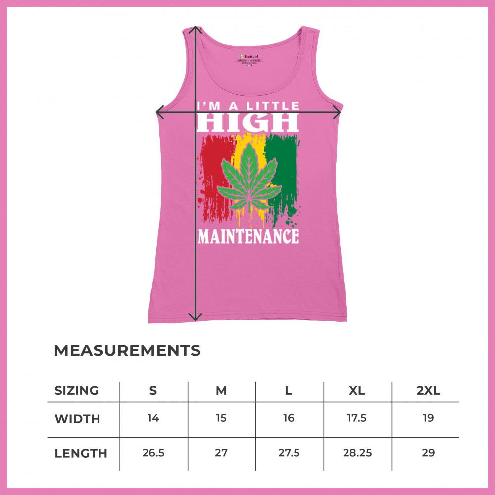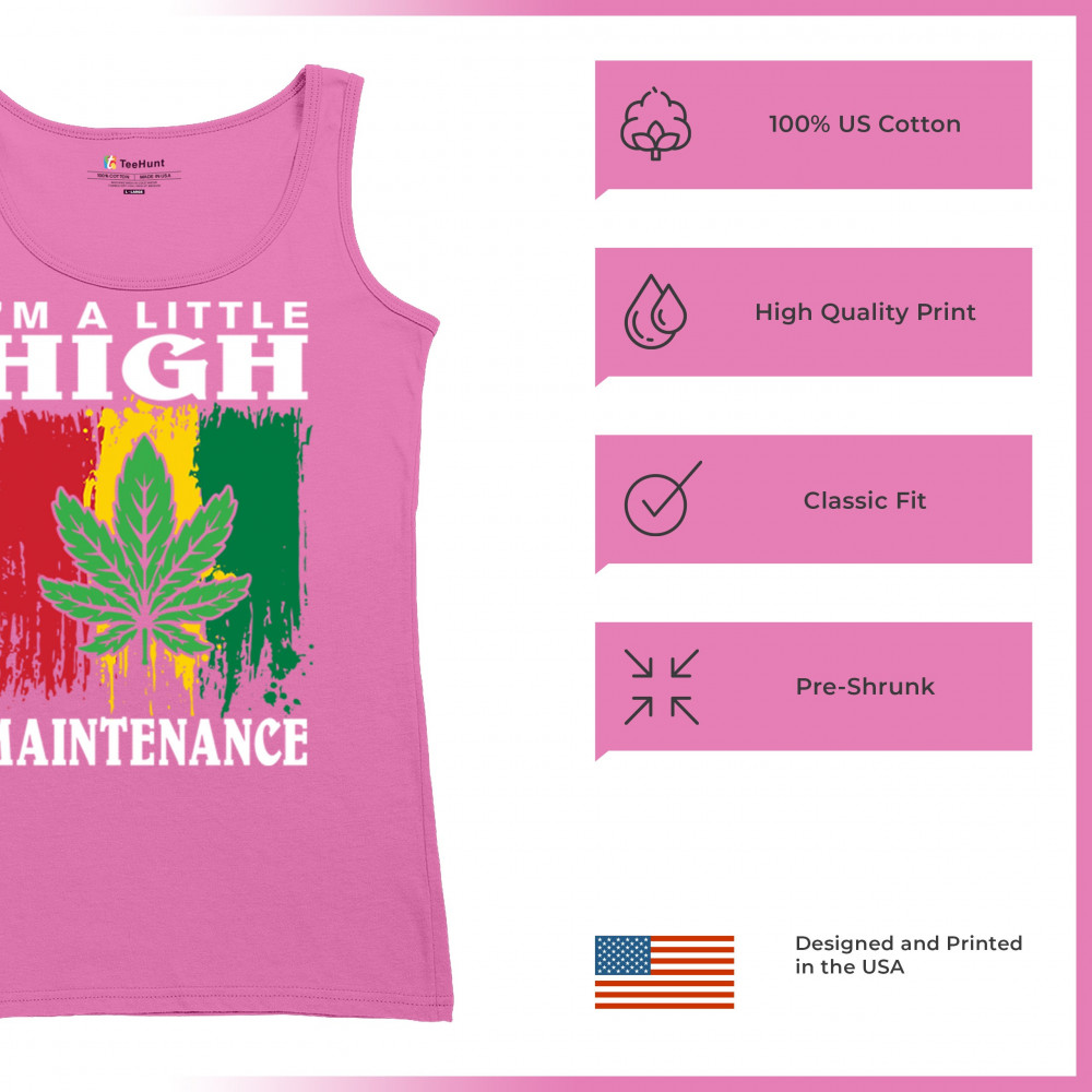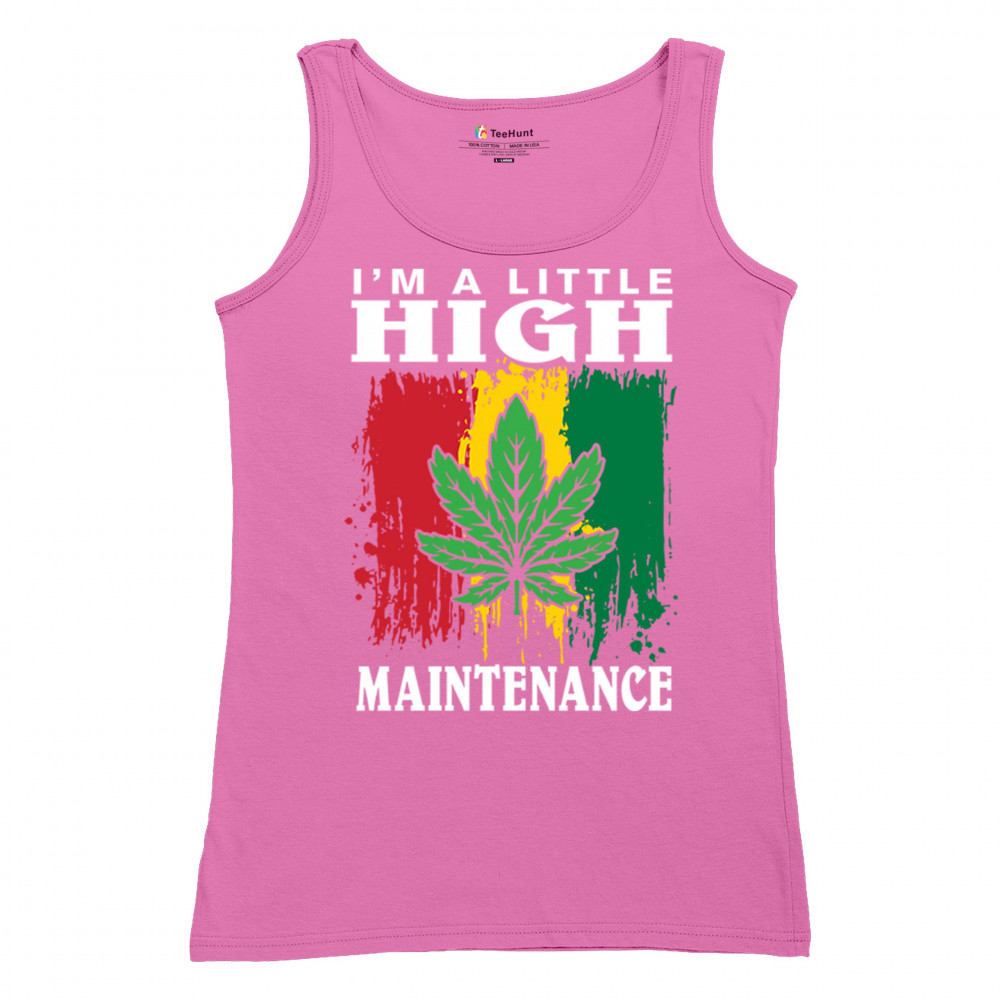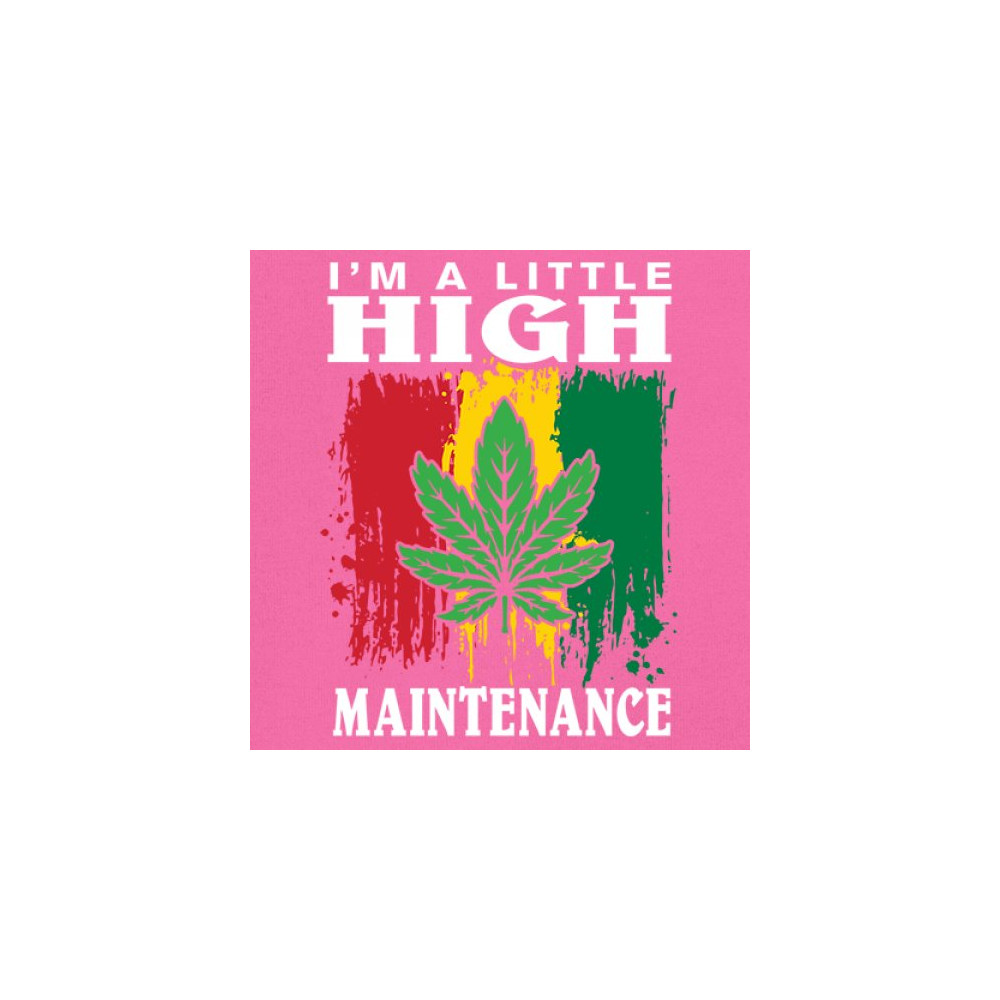 "I'm a Little High Maintenance" design with a bold cannabis leaf and vibrant background. Perfect for fans of Mary Jane, humor, and relaxed, trippy style.