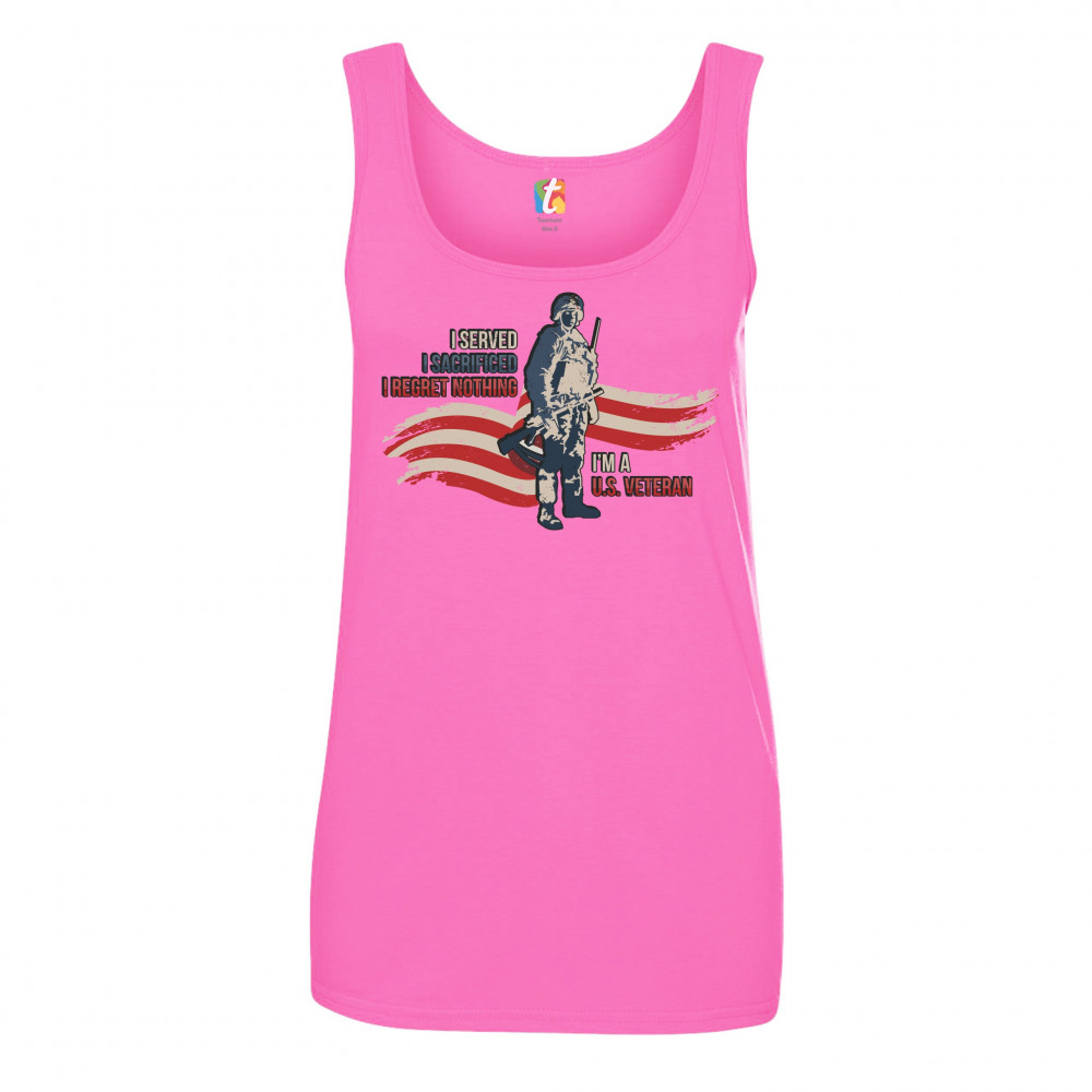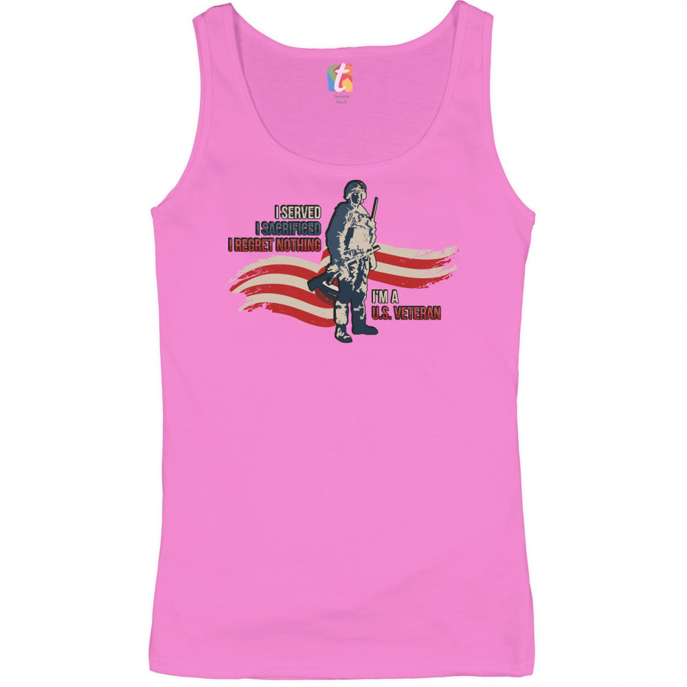 A patriotic print featuring a red-and-white stripe in the background and a soldier holding a rifle. The print says: "I Served I Sacrificed I Regreat Nothing I'm a U.S. Veteran". Great choice to wear on Independence Day or any other patriotic holiday.