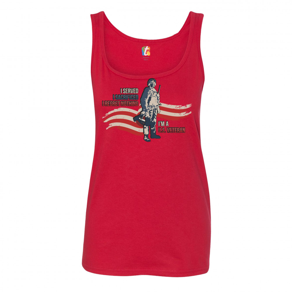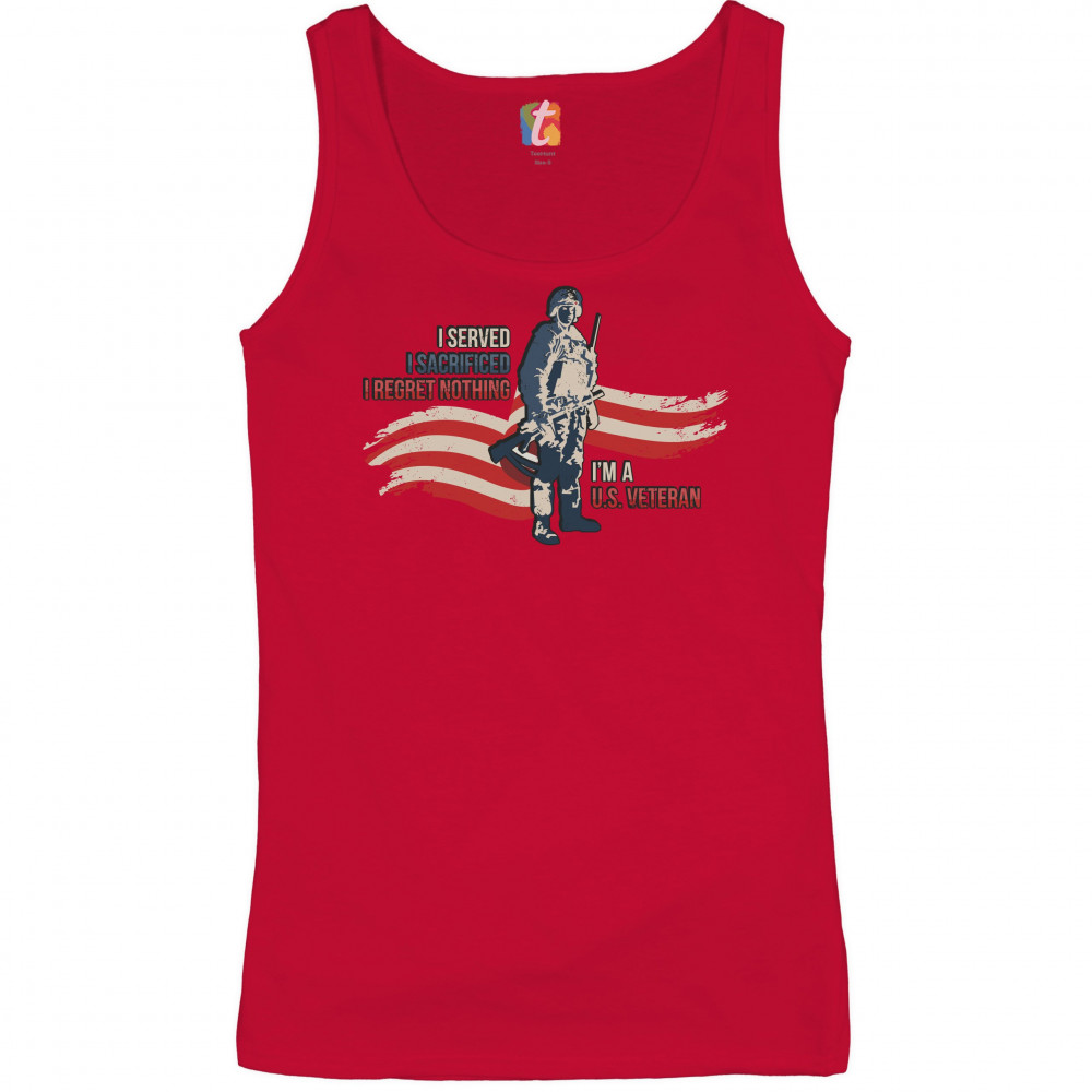 A patriotic print featuring a red-and-white stripe in the background and a soldier holding a rifle. The print says: "I Served I Sacrificed I Regreat Nothing I'm a U.S. Veteran". Great choice to wear on Independence Day or any other patriotic holiday.