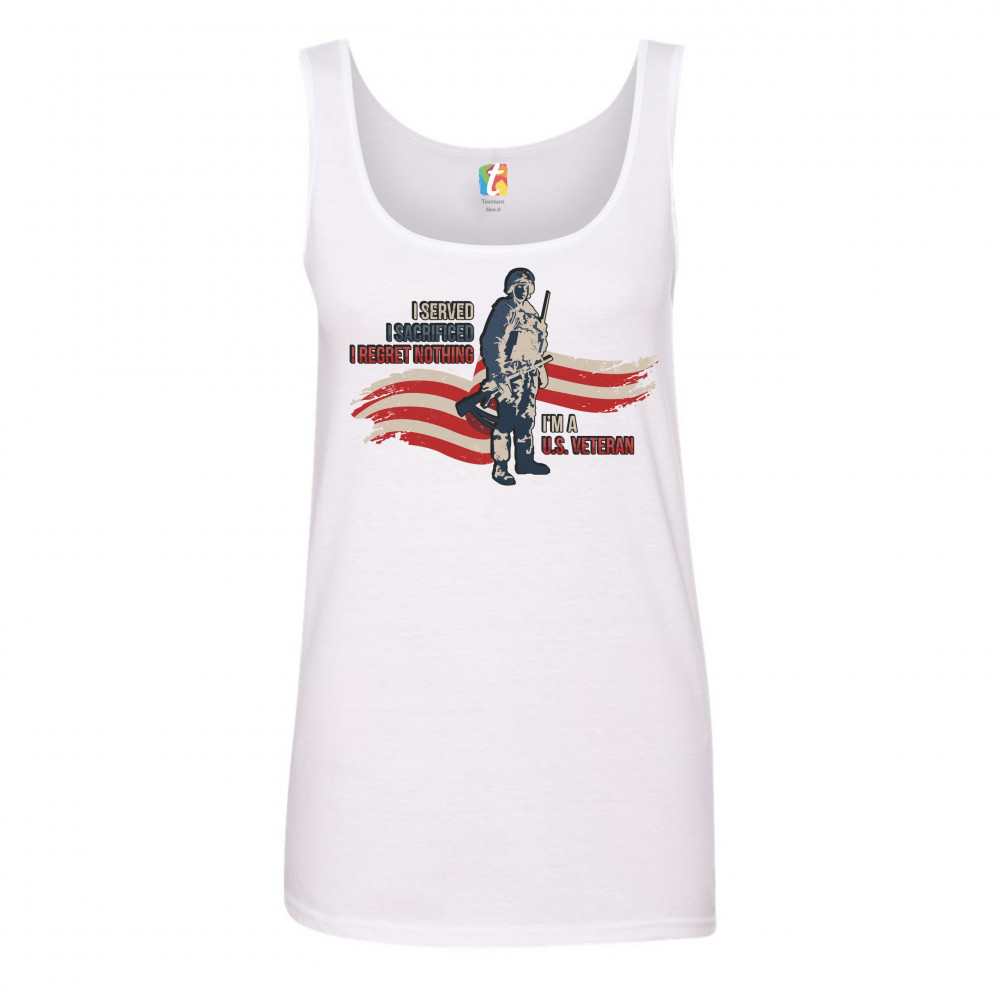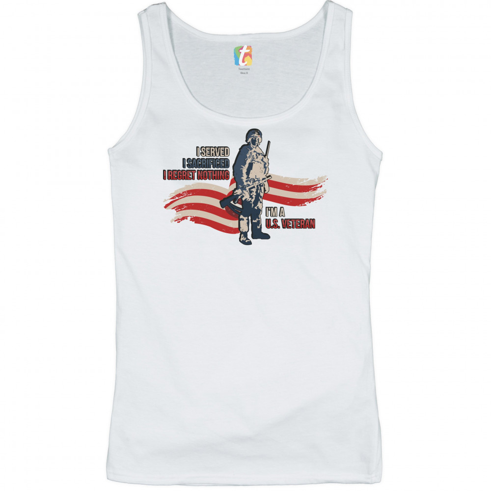 A patriotic print featuring a red-and-white stripe in the background and a soldier holding a rifle. The print says: "I Served I Sacrificed I Regreat Nothing I'm a U.S. Veteran". Great choice to wear on Independence Day or any other patriotic holiday.