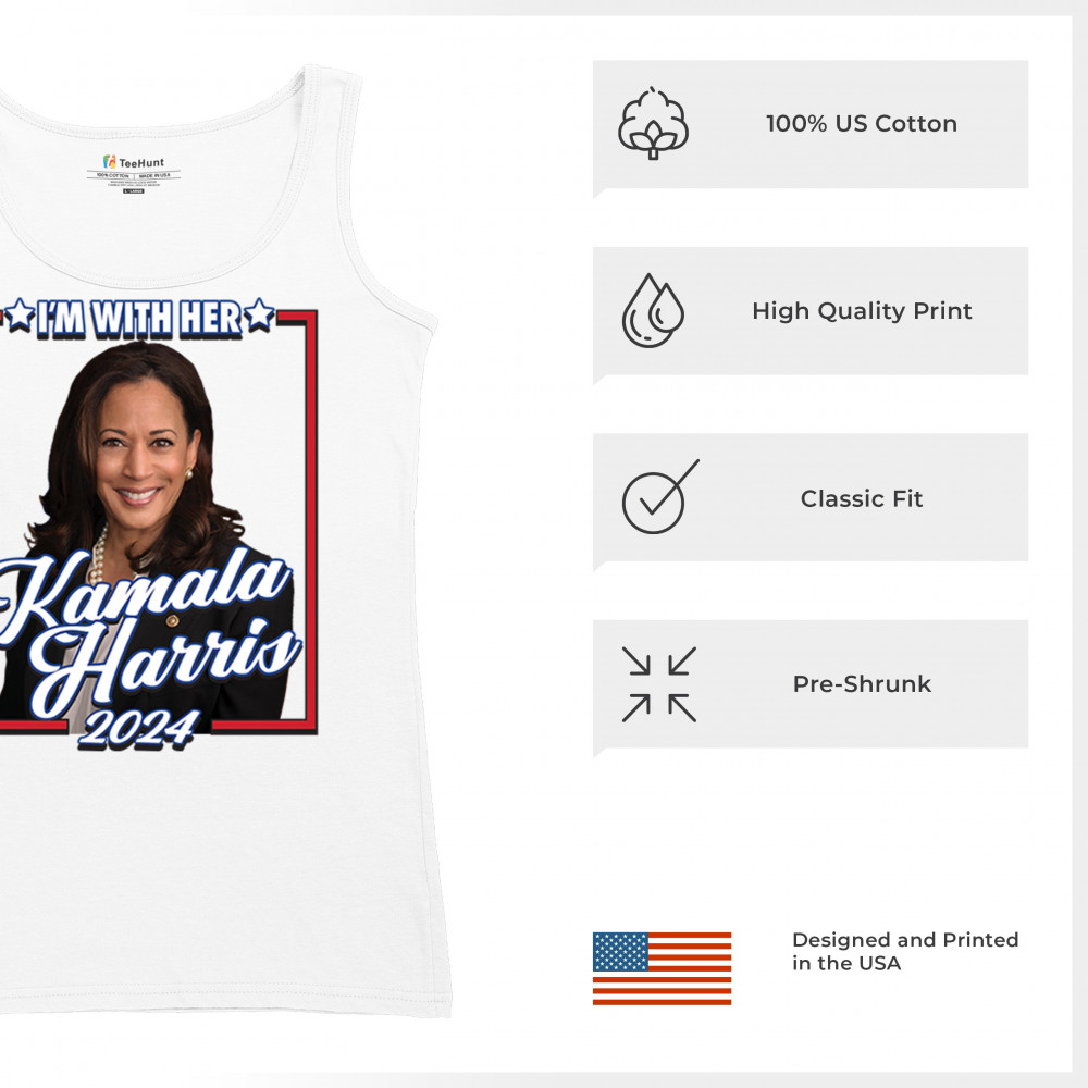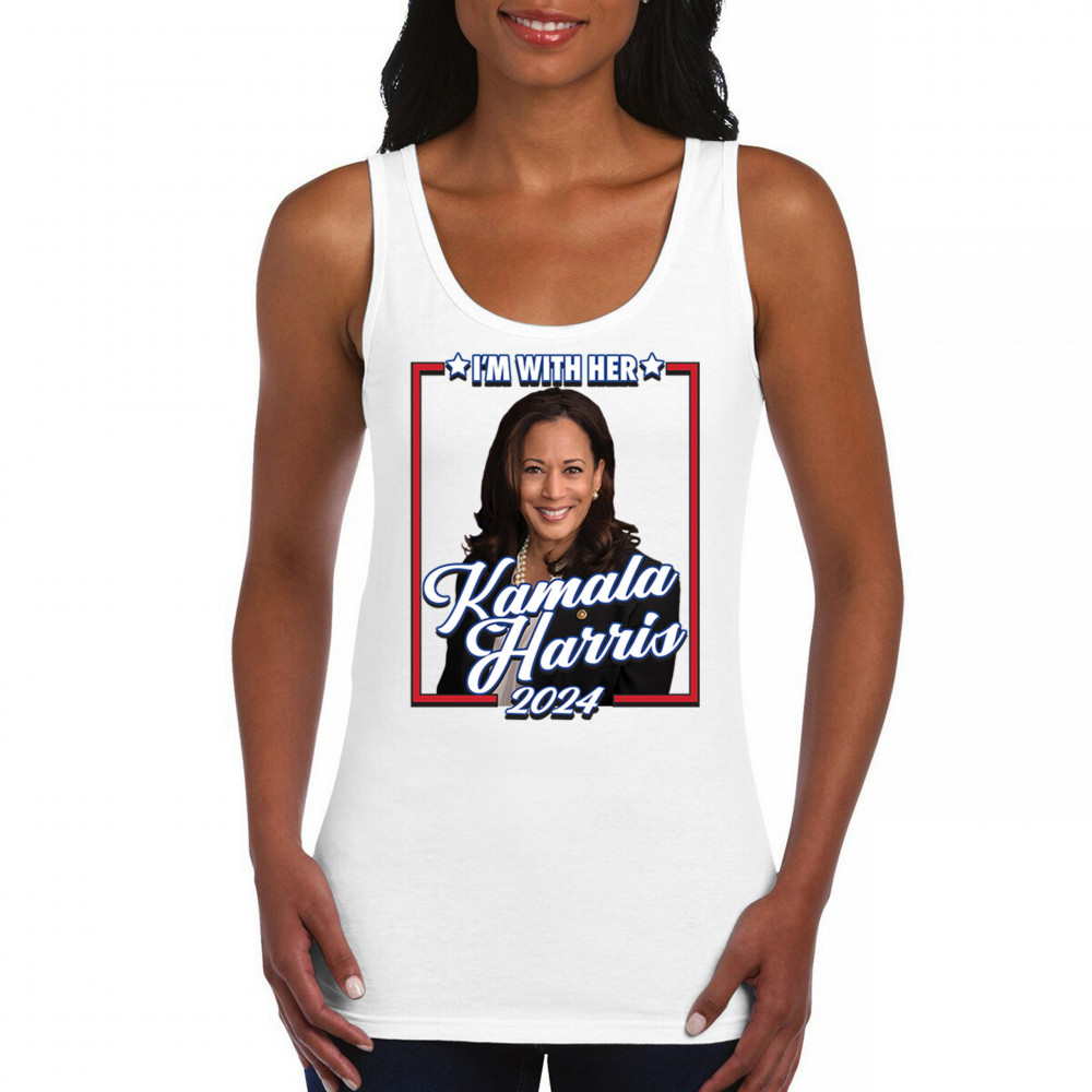 Stand with Kamala Harris in her 2024 presidential campaign with this vibrant design. Highlighting her commitment to progressive causes, this design is perfect for supporters of LGBTQ+ rights, women's rights, and social justice. Featuring the iconic "I'm With Her" slogan, it's a bold statement for anyone who believes in a brighter future. Wear it to rallies, events, or any day to show your support for Kamala Harris and her vision for America. A great addition to any supporter’s collection!