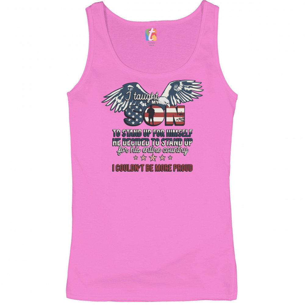 A patriotic print saying: "I Taught My Son to Stand up for Himself, He Decided to Stand Up for His Entire Country, I Couldn't Be More Proud". The print features a bald eagle, several stars and a small silhouette of a soldier inside of a letter "O" in "Son