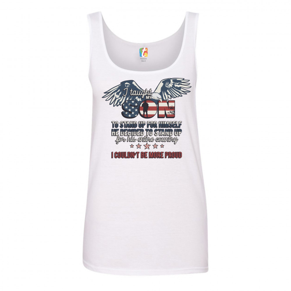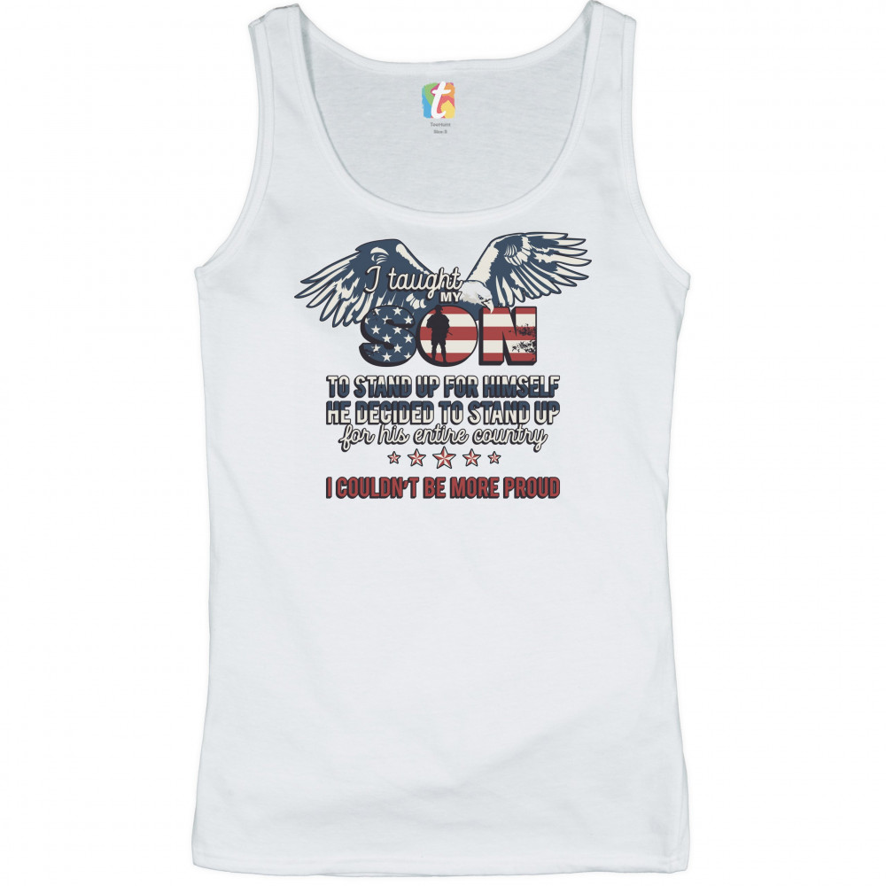 A patriotic print saying: "I Taught My Son to Stand up for Himself, He Decided to Stand Up for His Entire Country, I Couldn't Be More Proud". The print features a bald eagle, several stars and a small silhouette of a soldier inside of a letter "O" in "Son