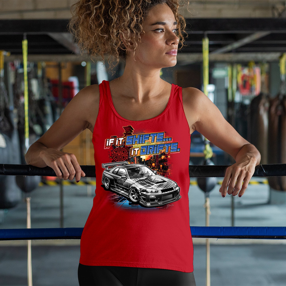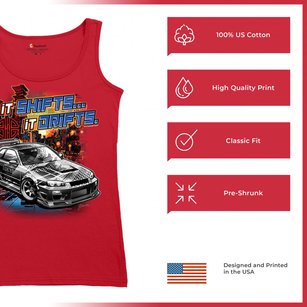 "If It Shifts, It Drifts" design. Perfect for car enthusiasts, featuring a detailed car and vibrant cityscape. Comfortable, durable, and stylish.
