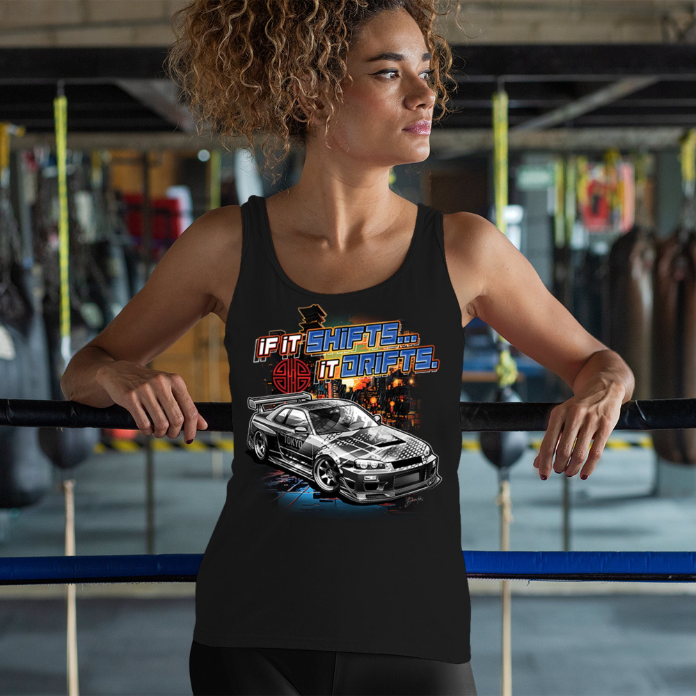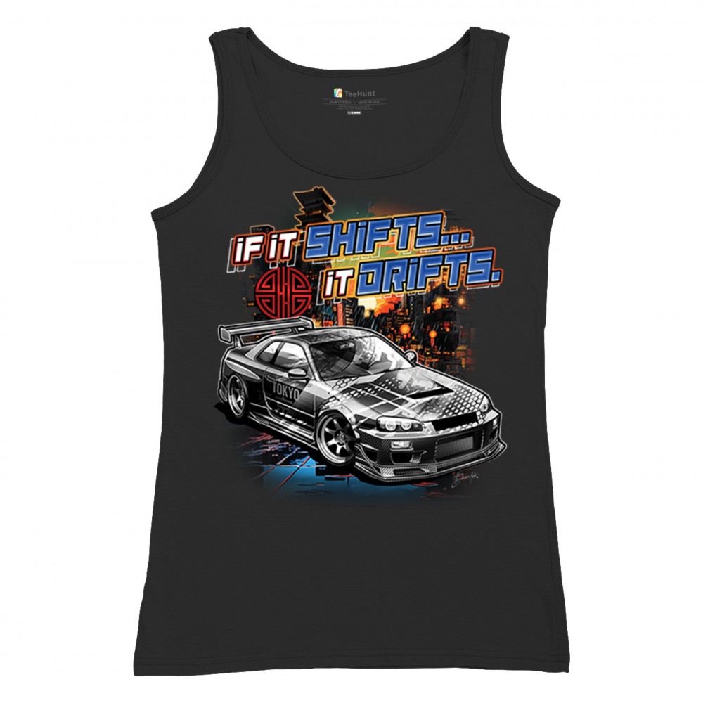 "If It Shifts, It Drifts" design. Perfect for car enthusiasts, featuring a detailed car and vibrant cityscape. Comfortable, durable, and stylish.