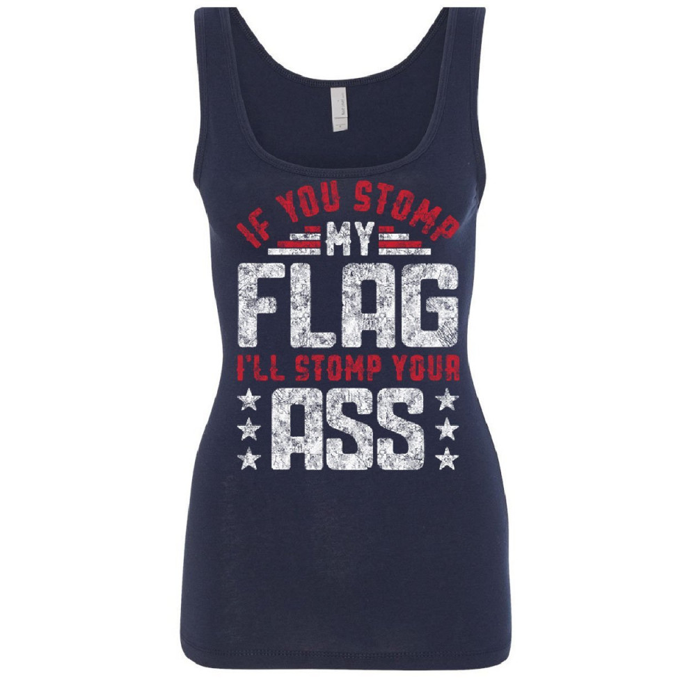 IF YOU STOMP MY FLAG women's tank top defend american flag patriot usa top navy blue