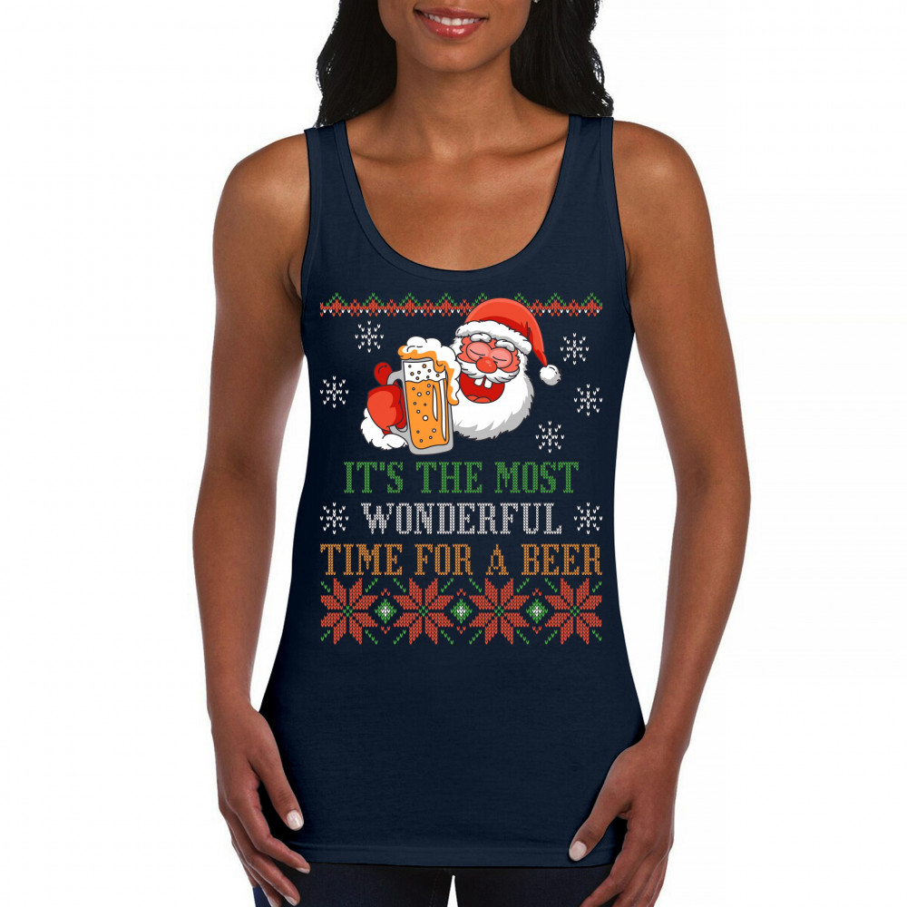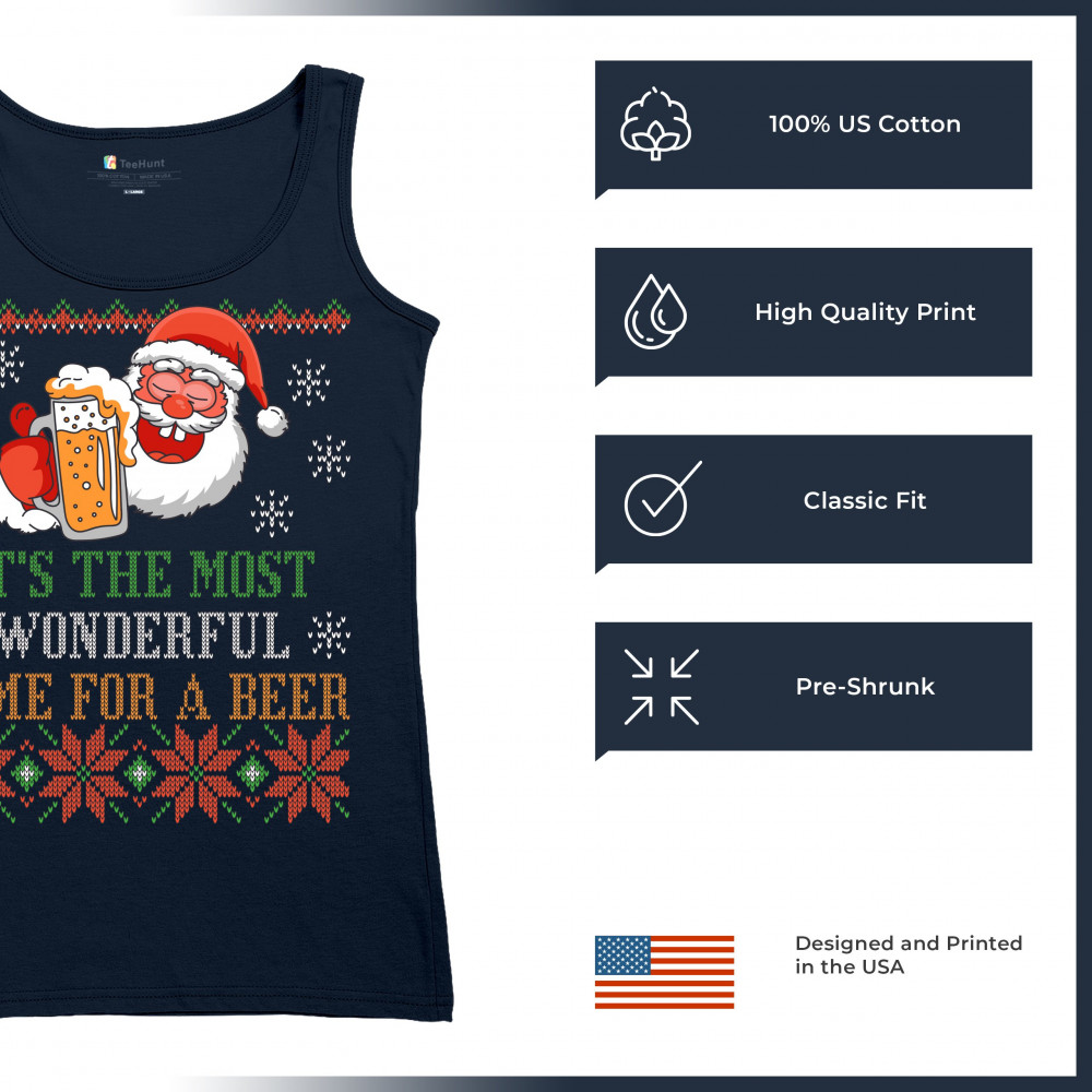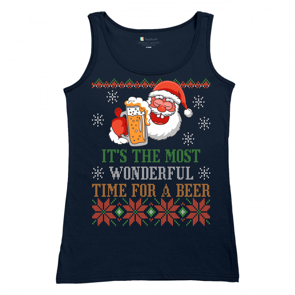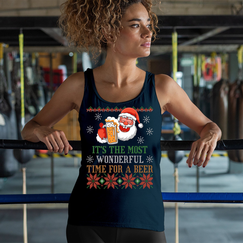 A print saying: "It's the Most Wonderful Time for a Beer" and featuring Santa Claus holding a glass of beer. The print is designed as an ugly sweater. Amazing choice for a single person who wants to make people smile and spread positive vibes on Christmas