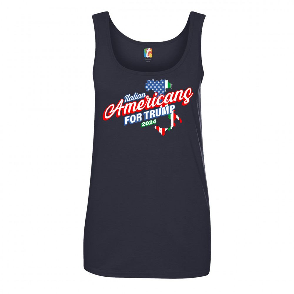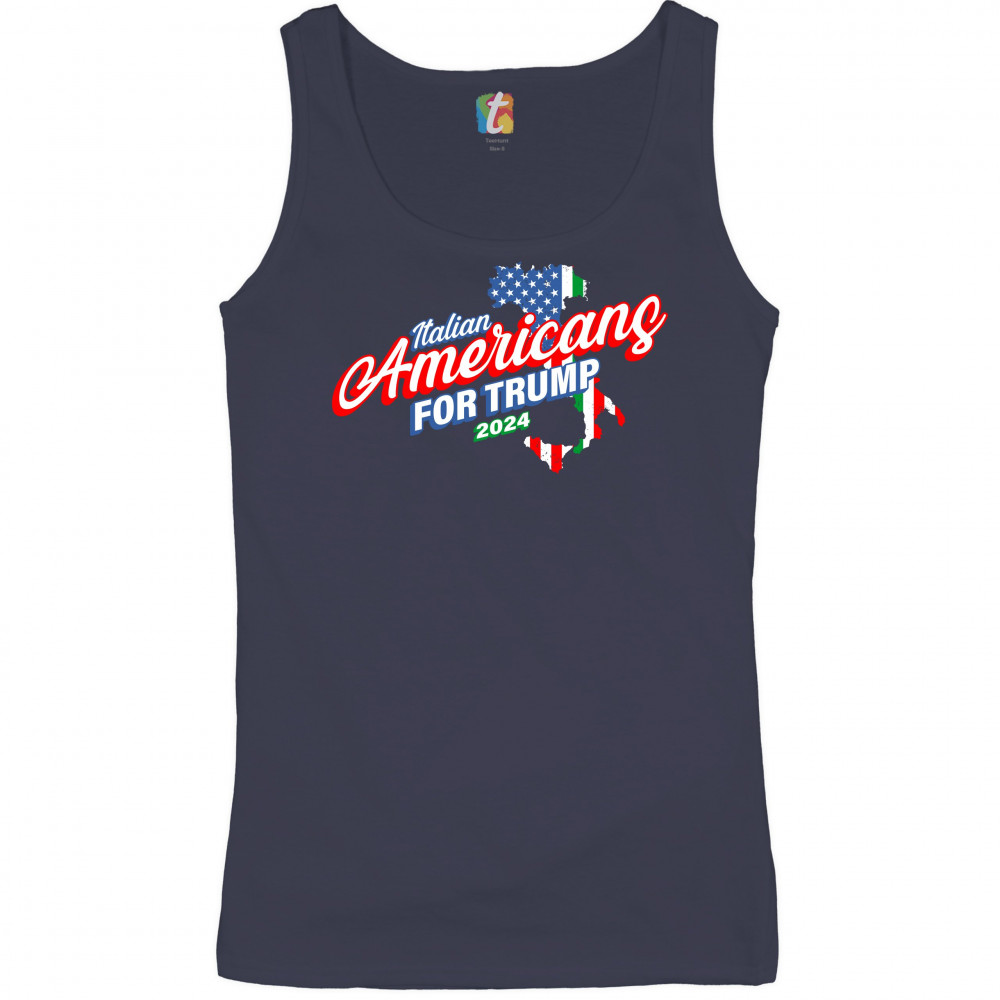 A political print saying "Italian Americans for Trump 2024". The print features a silhouette of Italy in the background with parts of the American and Italian flags inside of it. A great choice to wear for a Trump rally or give as a gift to a Donald Trump
