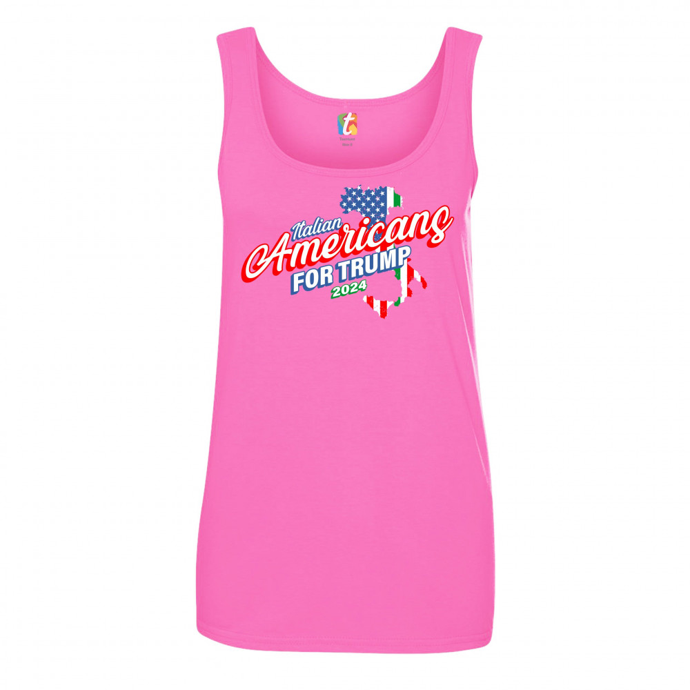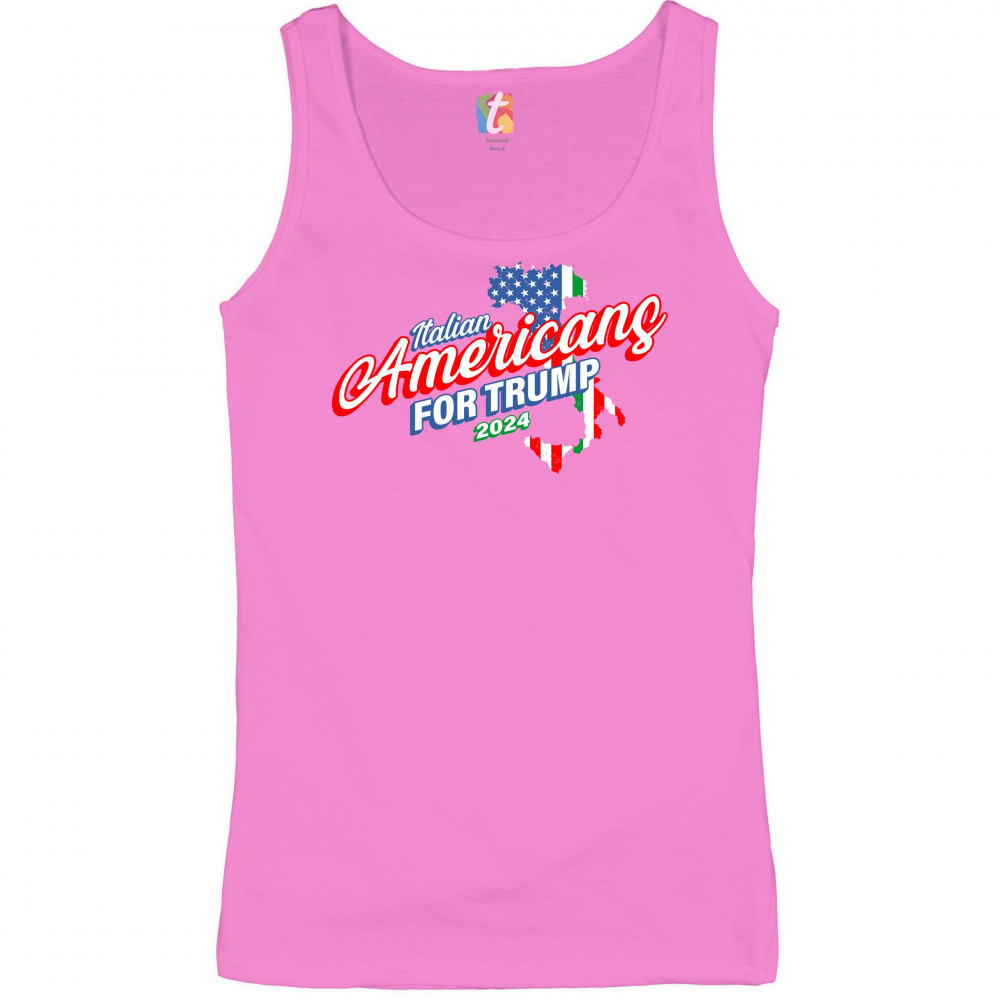 A political print saying "Italian Americans for Trump 2024". The print features a silhouette of Italy in the background with parts of the American and Italian flags inside of it. A great choice to wear for a Trump rally or give as a gift to a Donald Trump