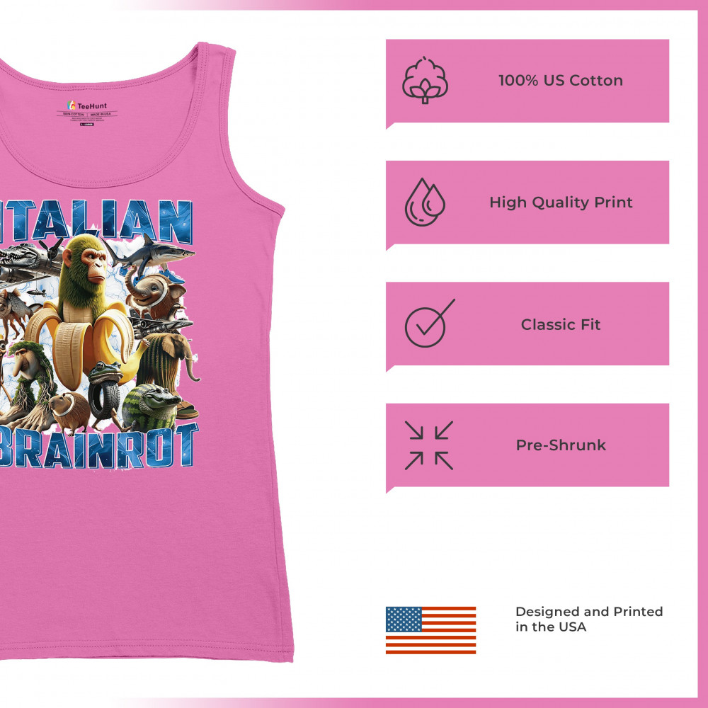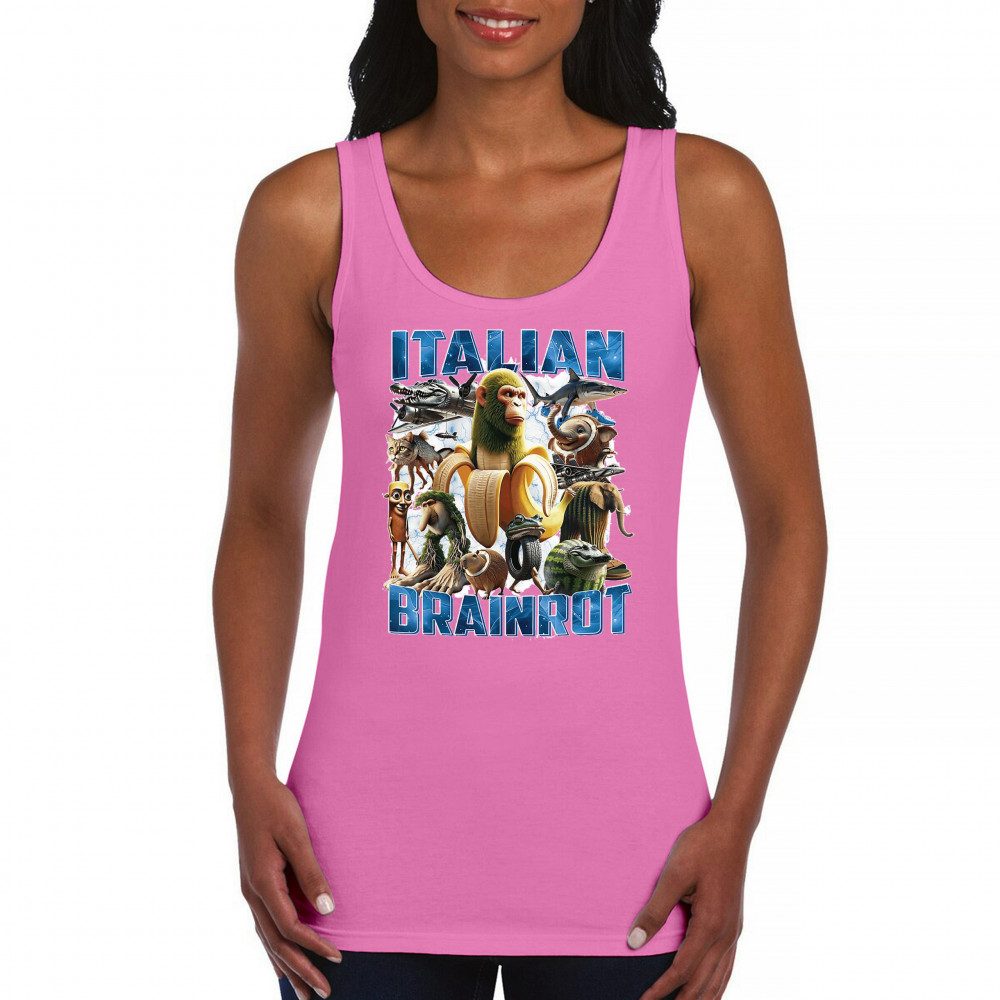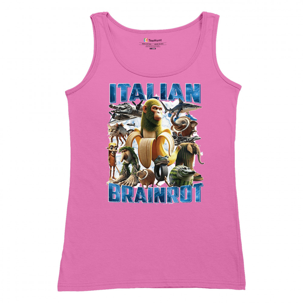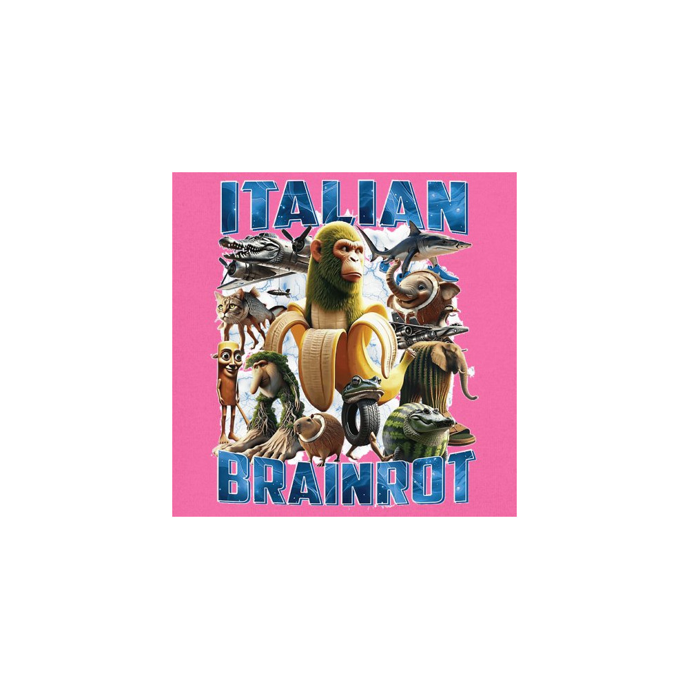 This design captures the full force of Italian brainrot—bananas, sharks, monkeys, and meme beasts collide in an unfiltered internet-core explosion. Perfect for fans of cursed humor, Gen Z trends, absurd fashion, TikTok memes, ironic style, surreal pop art, chaotic culture, digital nonsense, Gen Alpha brainrot, and hyper-online energy.