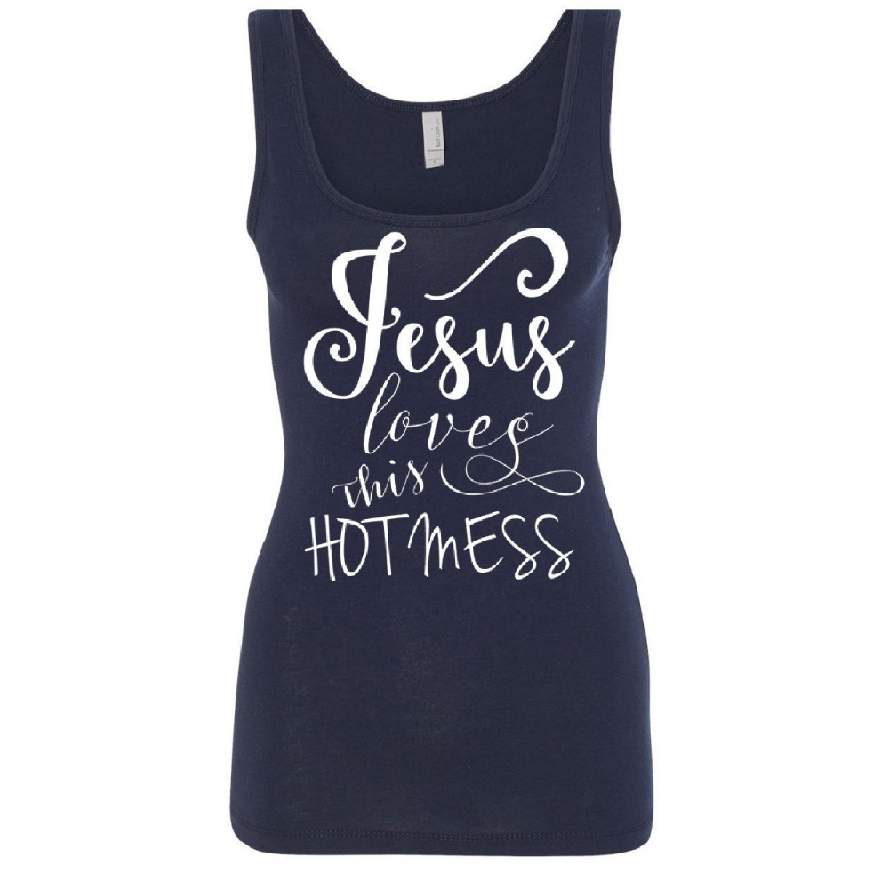 JESUS LOVES THIS HOT MESS women's tank top funny religious christian lord top navy blue