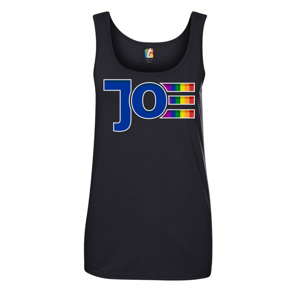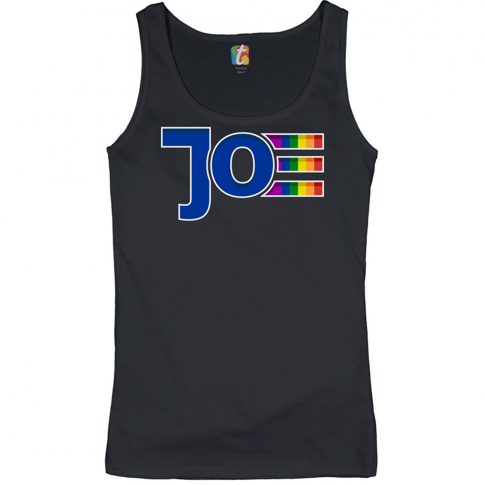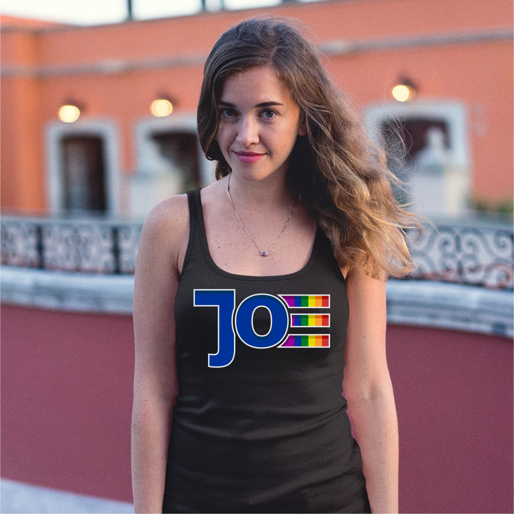 A political print featuring the name of the democratic presidential candidate "Joe". The letter "e" is painted with the colors of the lgbt rainbow. It is a great choice to wear to show your support for the democratic presidential nominee and his vice pres