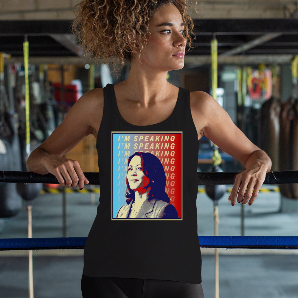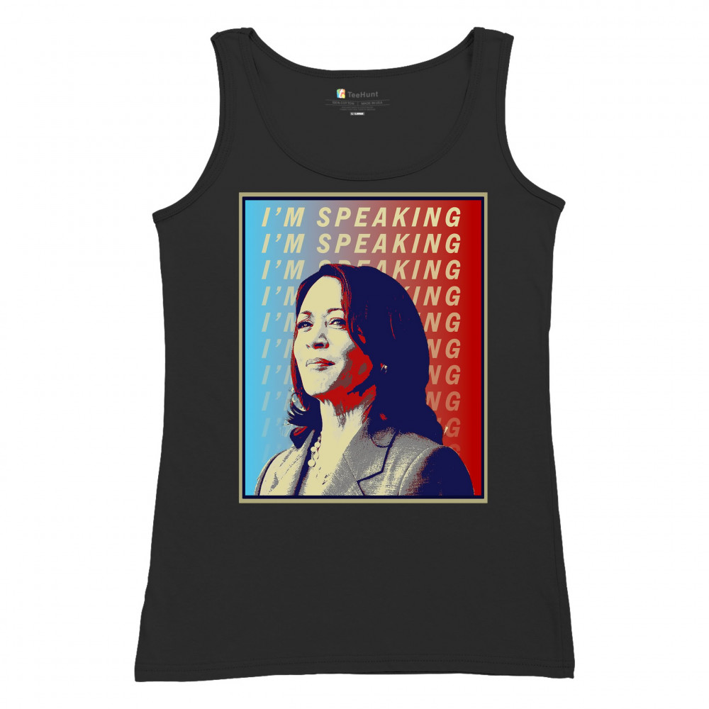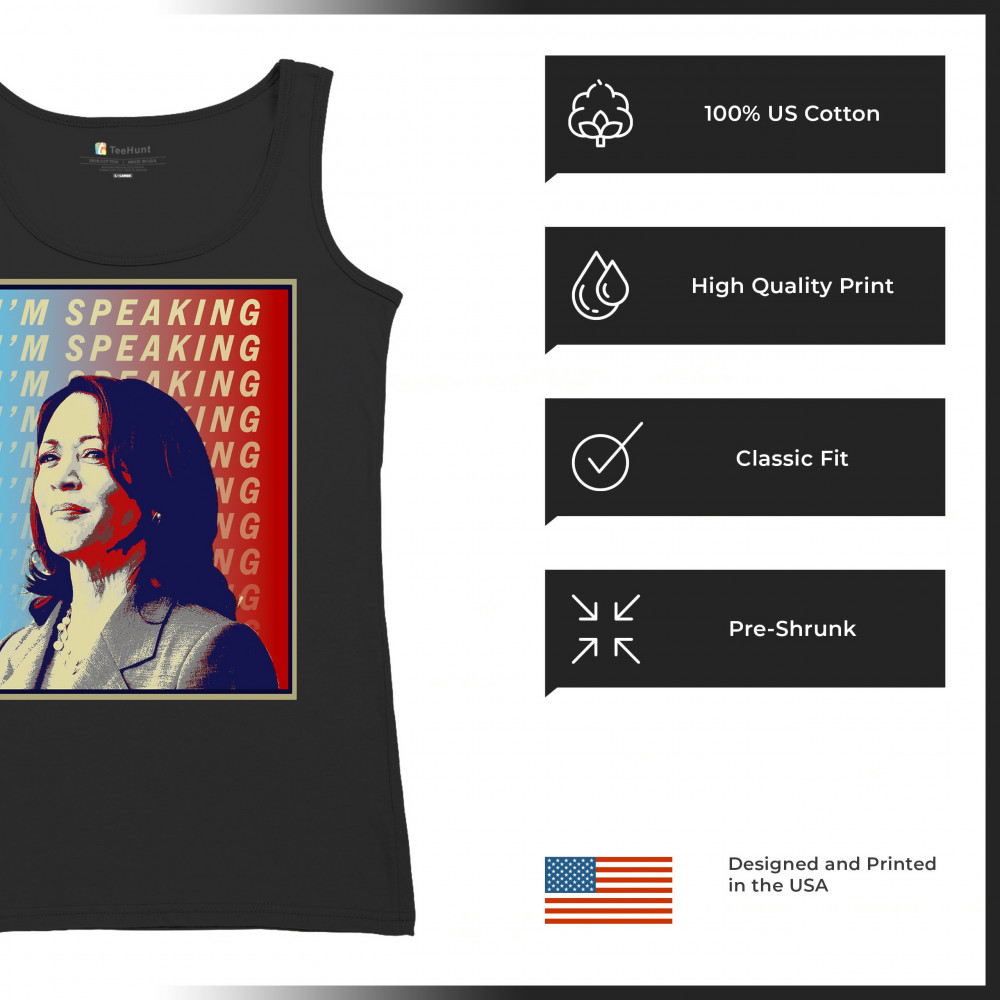Support Kamala Harris with this bold and inspiring design. "I'M SPEAKING" echoes her powerful voice in the political arena, making it perfect for anti-Trump supporters, liberals, and Democrats. Crafted from durable materials, this design is comfortable for any event, from rallies to casual outings. Celebrate diversity and the historic candidacy of the potential first female president, resonating with black Americans, Hispanic Americans, LGBTQ supporters, and other minorities. Make a statement of hope and progress with this unique design.