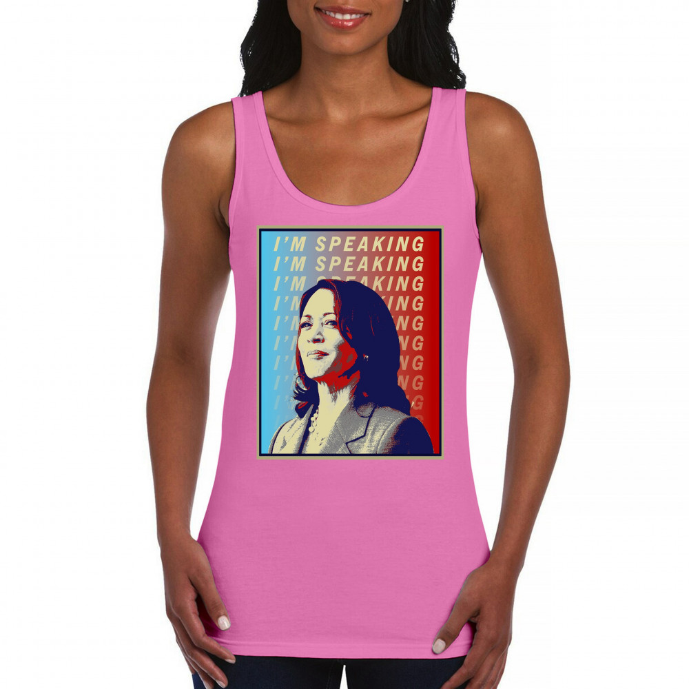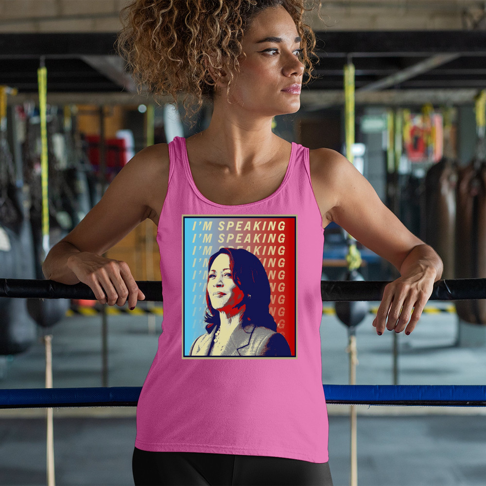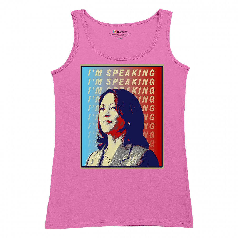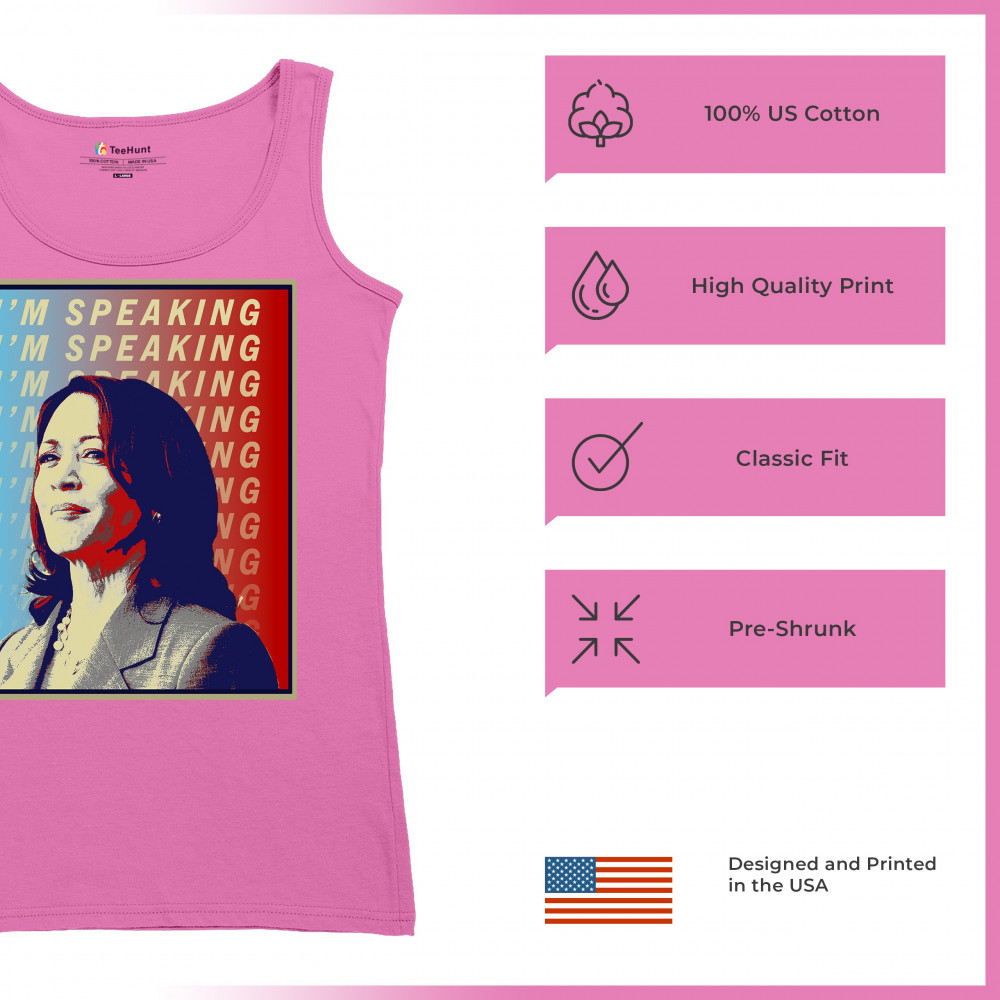 Support Kamala Harris with this bold and inspiring design. "I'M SPEAKING" echoes her powerful voice in the political arena, making it perfect for anti-Trump supporters, liberals, and Democrats. Crafted from durable materials, this design is comfortable for any event, from rallies to casual outings. Celebrate diversity and the historic candidacy of the potential first female president, resonating with black Americans, Hispanic Americans, LGBTQ supporters, and other minorities. Make a statement of hope and progress with this unique design.