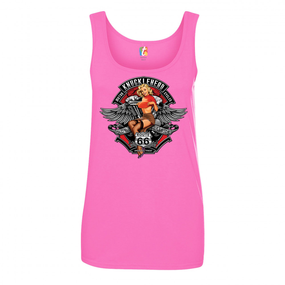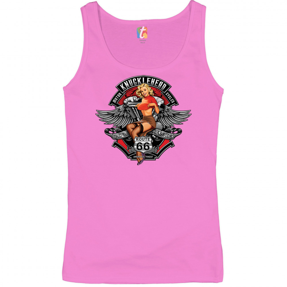 A print featuring a sexy pin-up girl. In front of her legs there is a "Route 66" sign. In the background there is a motorcycle engine and wings behind it. The print says: "Knucklehead motorcycles since 1903. Old time classics. America's finest". A great c