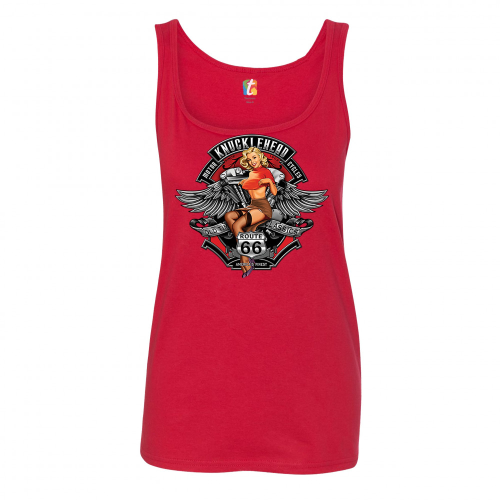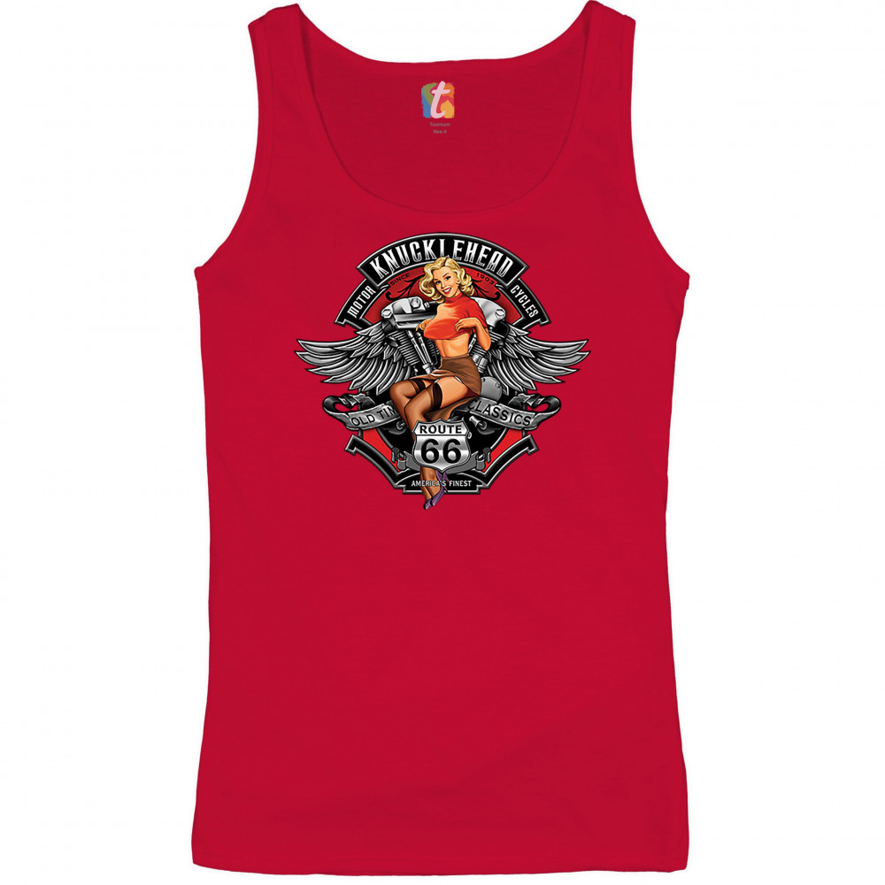 A print featuring a sexy pin-up girl. In front of her legs there is a "Route 66" sign. In the background there is a motorcycle engine and wings behind it. The print says: "Knucklehead motorcycles since 1903. Old time classics. America's finest". A great c