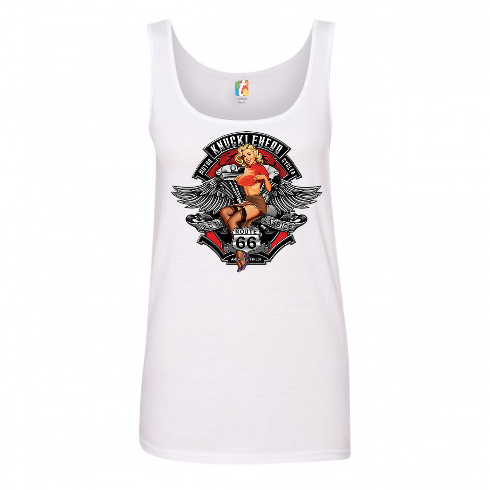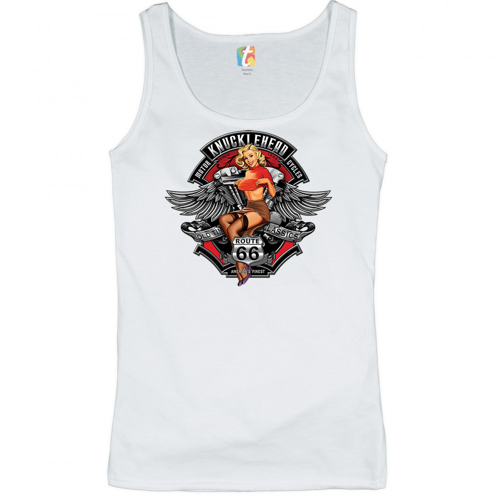 A print featuring a sexy pin-up girl. In front of her legs there is a "Route 66" sign. In the background there is a motorcycle engine and wings behind it. The print says: "Knucklehead motorcycles since 1903. Old time classics. America's finest". A great c