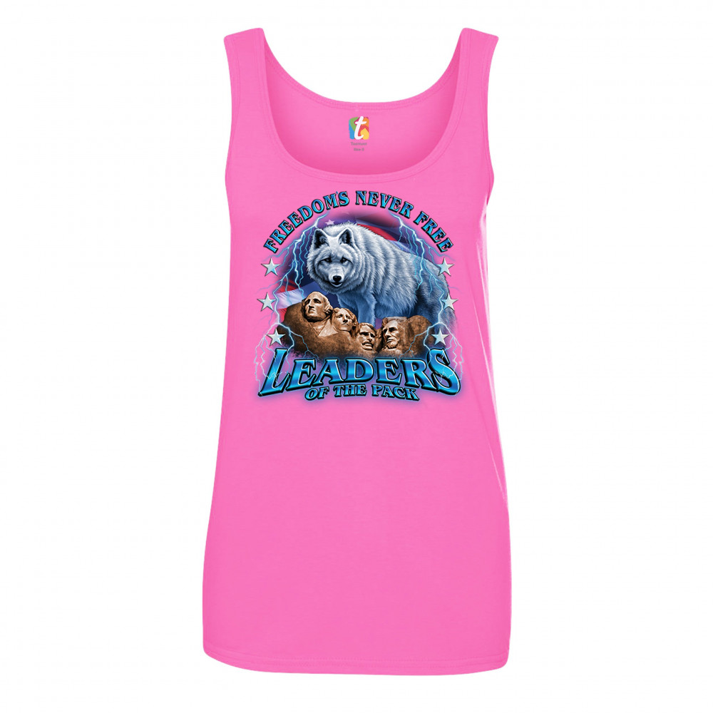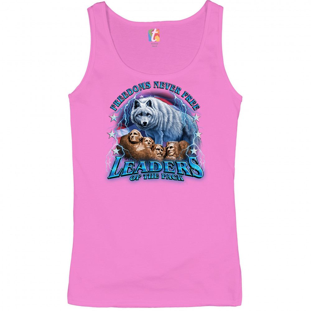 A patriotic print featuring the Mount Rushmore. There is a huge white wolf with the American flag in the background and lightning strikes all over the place. The print says: "Freedom's Never Free, Leaders of the Pack". Great choice to wear on Independence