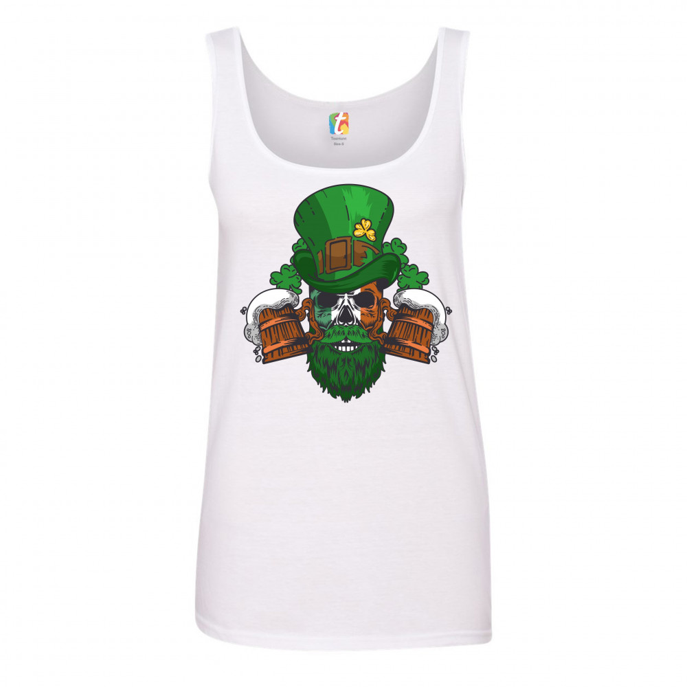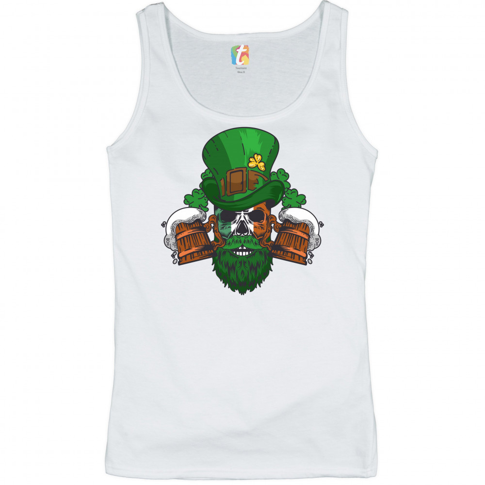 A print featuring a skull with green beard and Irish flag face. The skull is wearing a leprechaun hat. There are two beer mugs and numerous shamrocks around the skull. A great choice to wear on March 17 to celebrate the St. Patrick's Day and showcase your