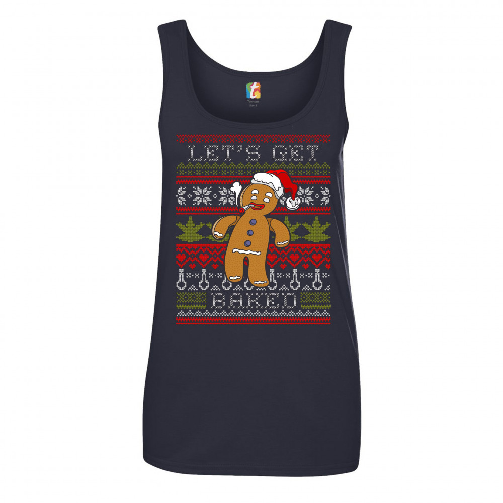 LET'S GET BAKED women's tank top ugly sweater gingerbread man 420 marijuana navy blue