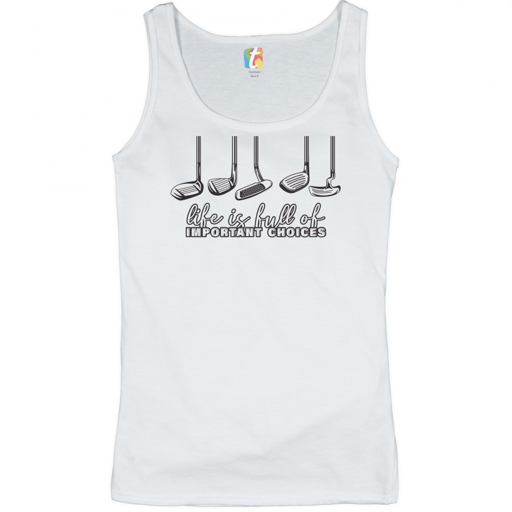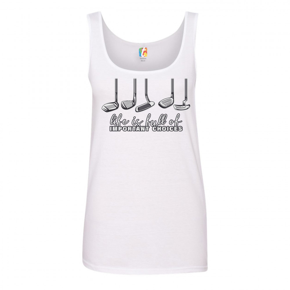 LIFE IS FULL OF IMPORTANT CHOICES women's tank top funny golf clubs golfing white
