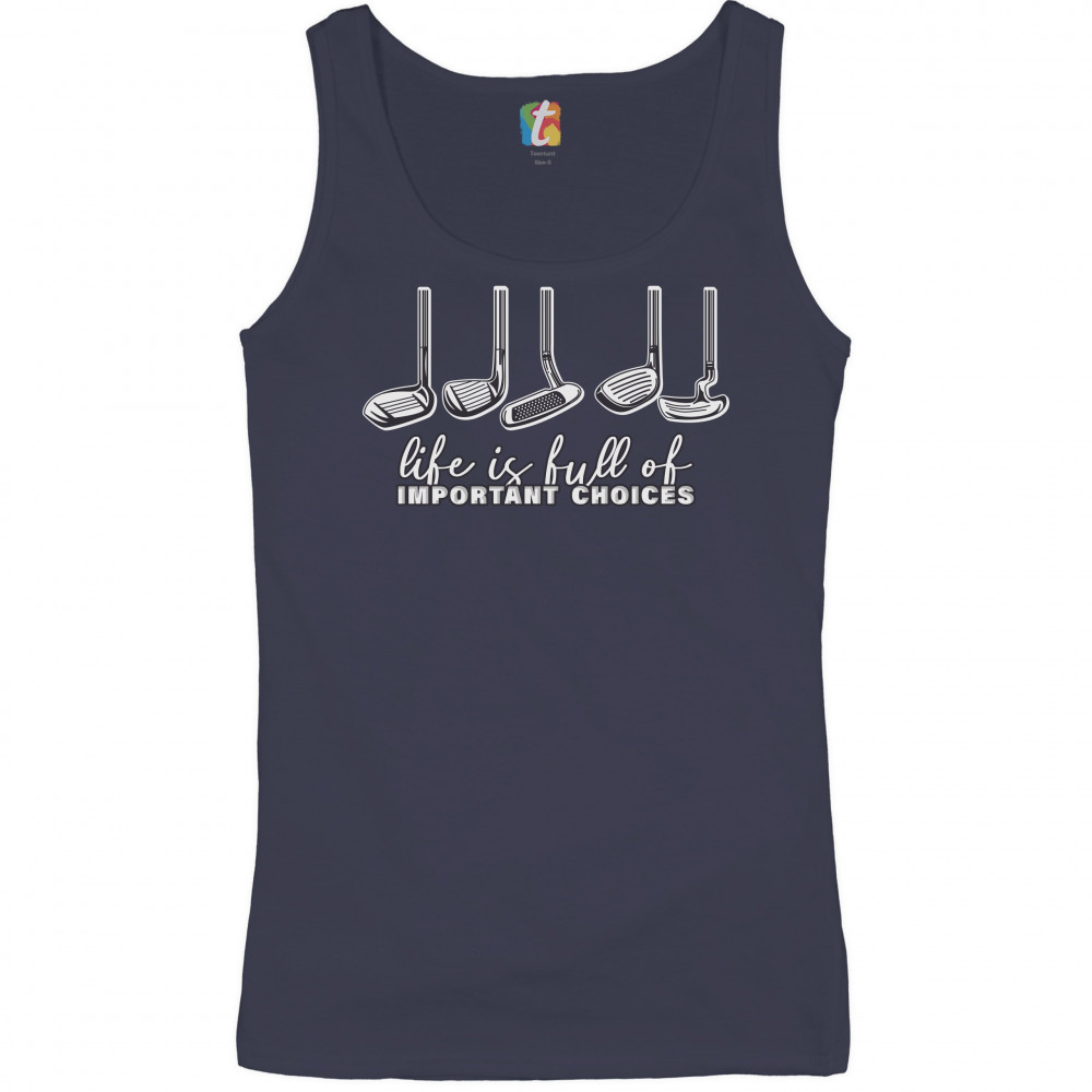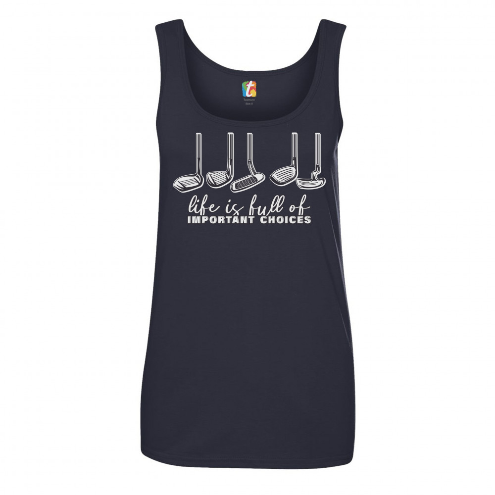 LIFE IS FULL OF IMPORTANT CHOICES women's tank top funny golf clubs golfing navy blue