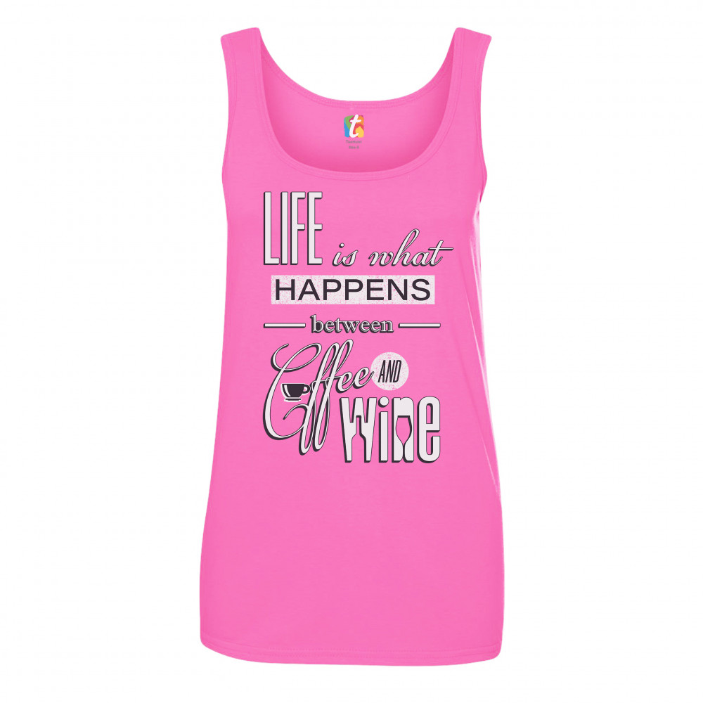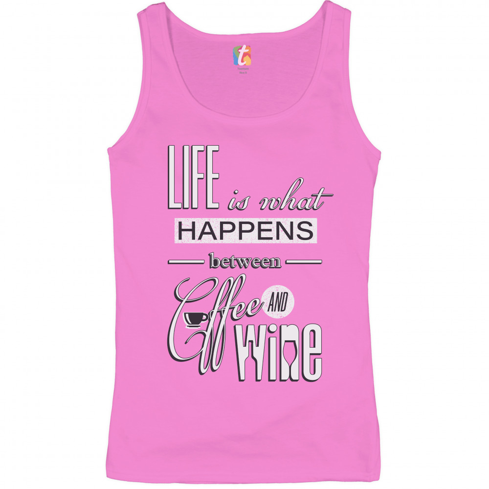 A print saying "Life is what happens between coffee and wine". Inside the letter "C" in "coffee" there is a cup and inside the word "wine" there are silhouettes of a bottle and a glass. Wear it to spread positive vibes and show your passion for the two best drinks in the universe!
