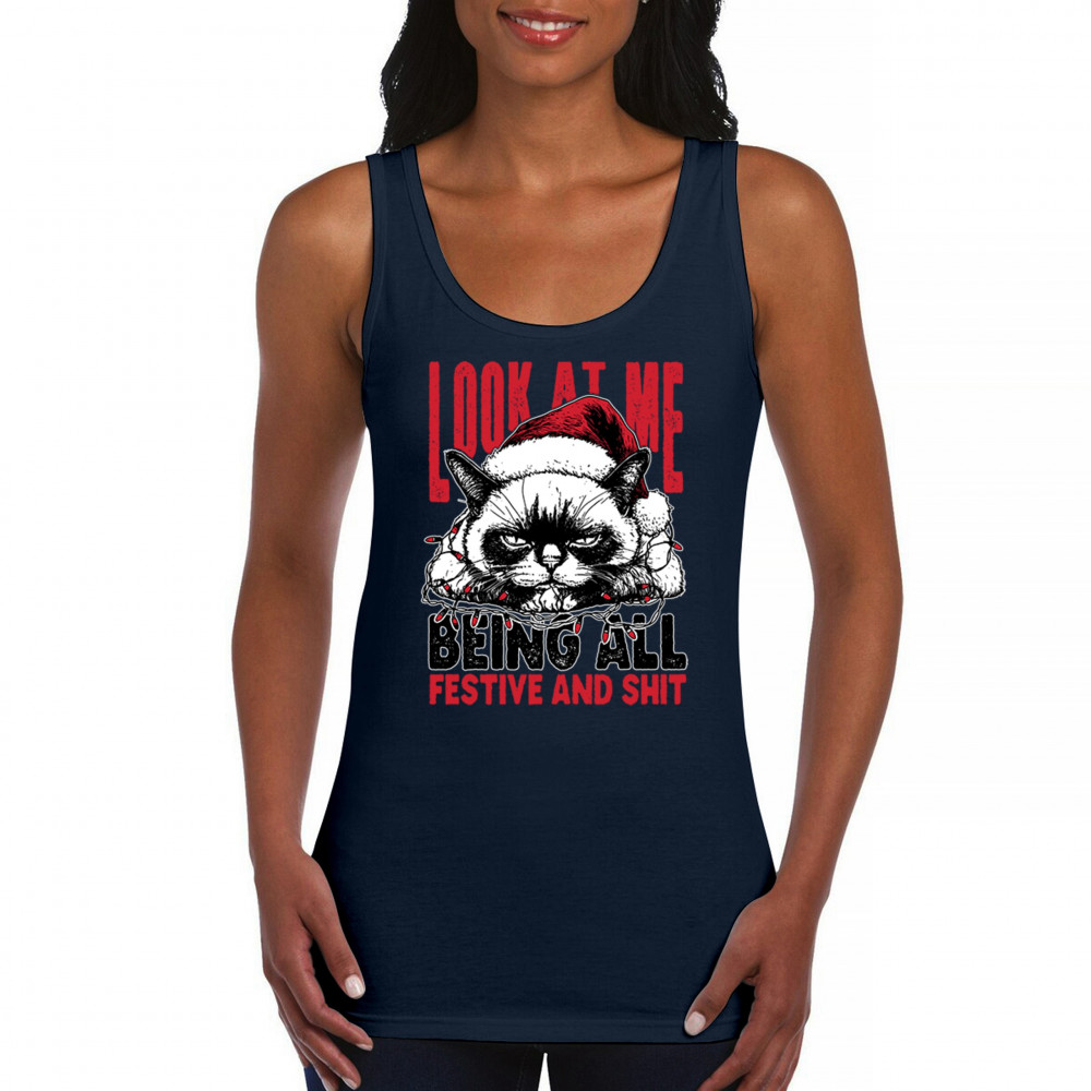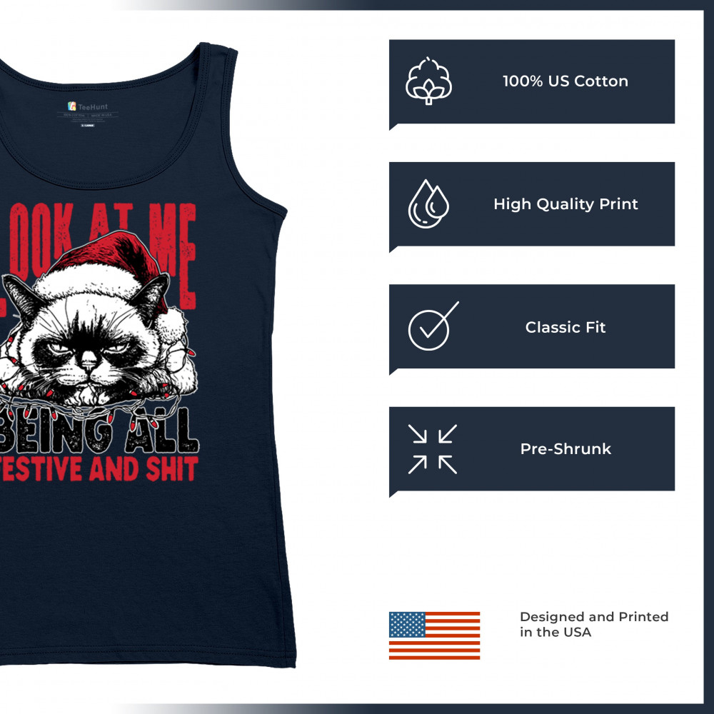 Grumpy Cat Christmas design with Santa hat, Christmas tree humor, Let It Snow vibes, Jingle Bells style, and sarcastic Merry Xmas spirit.