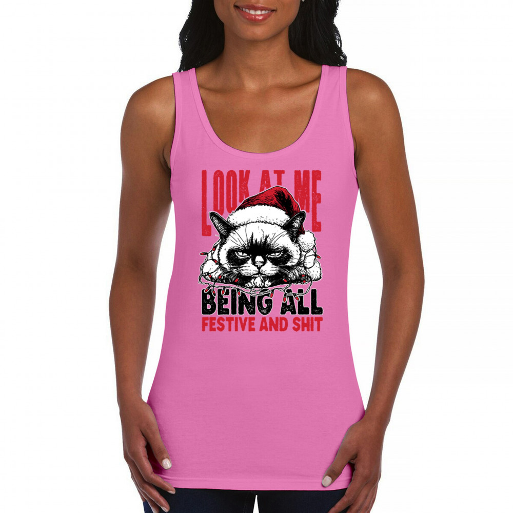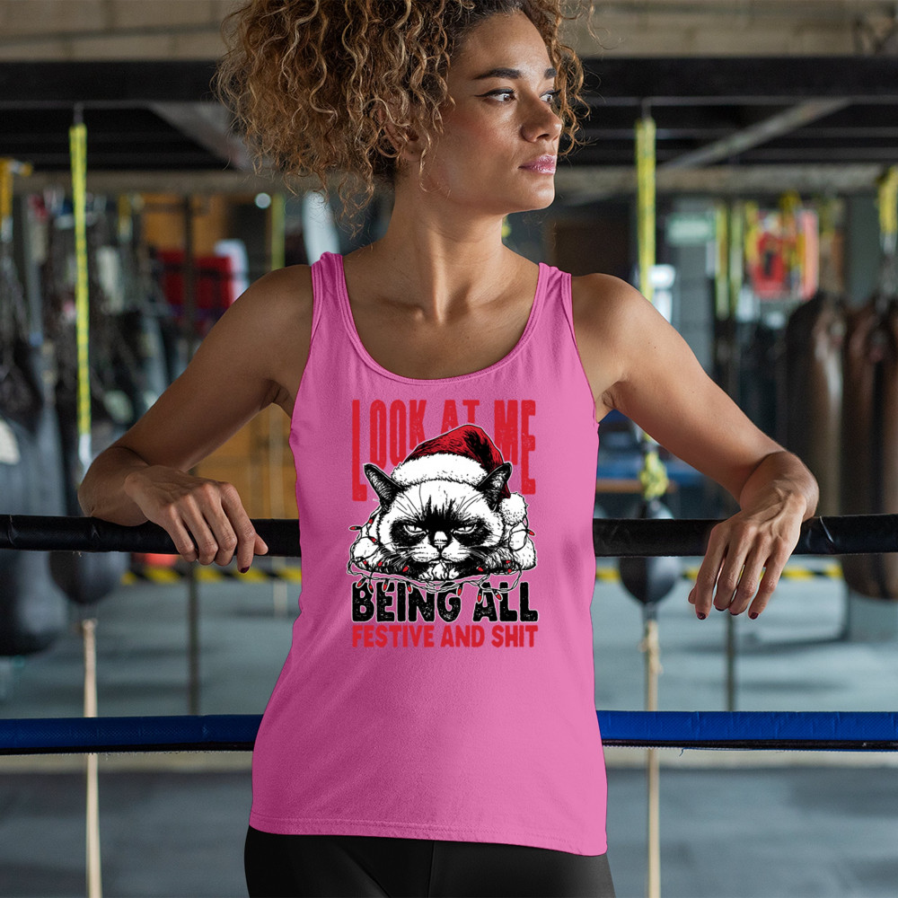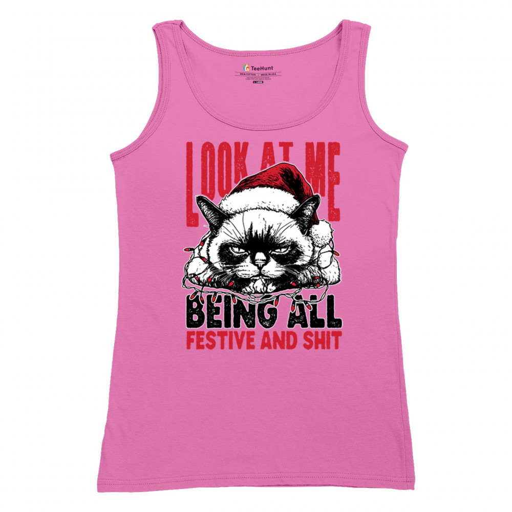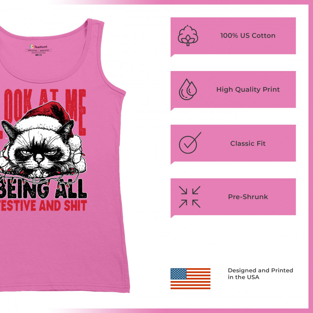 Grumpy Cat Christmas design with Santa hat, Christmas tree humor, Let It Snow vibes, Jingle Bells style, and sarcastic Merry Xmas spirit.