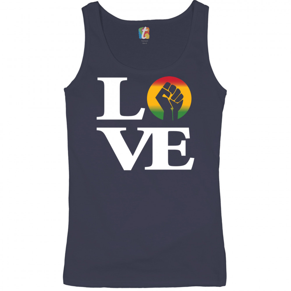 A political print depicting the word "Love" with a circle, painted in the Pan-African colors with a power fist inside of it, instead of the letter "o". Great choice to wear to spread an important message.