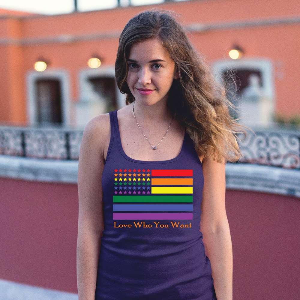 A print featuring a phrase: "Love Who You Want" and the American Flag painted in rainbow colors. Great choice to wear as a proud queer person.
