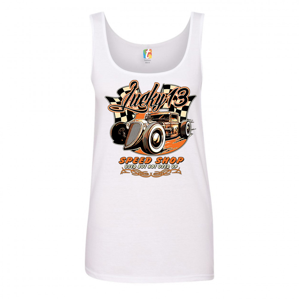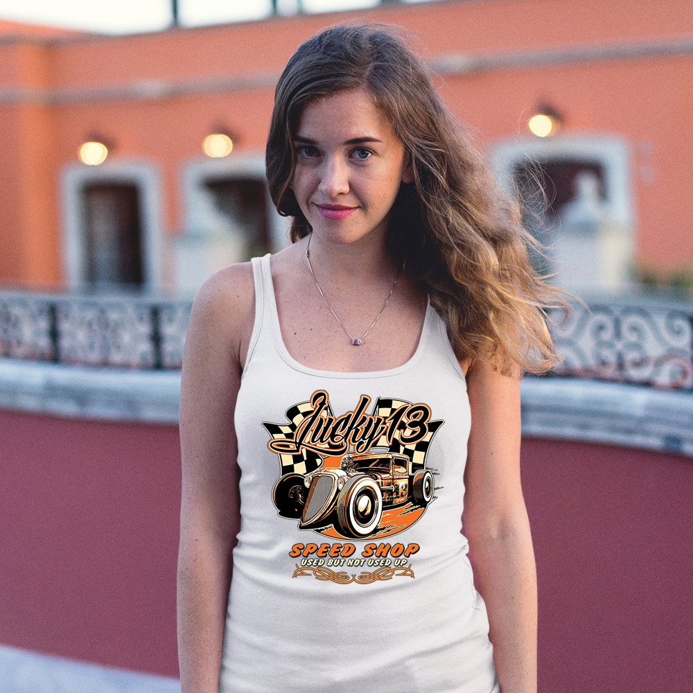 LUCKY 13 SPEED SHOP women's tank top rat rod route 66 vintage racing car white