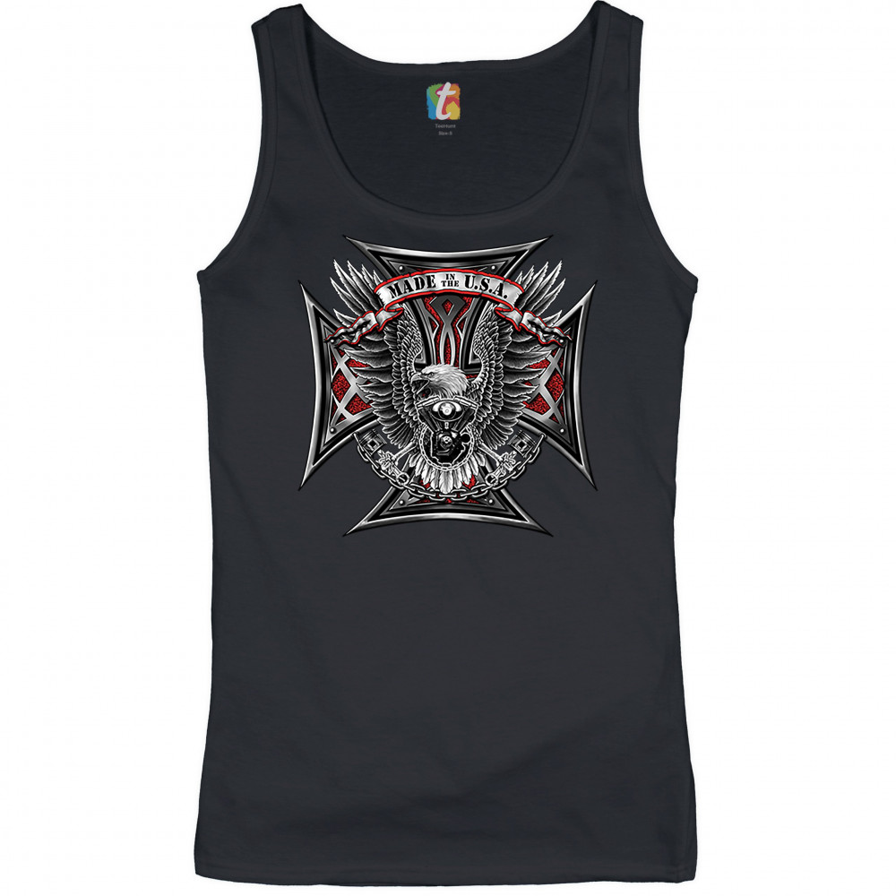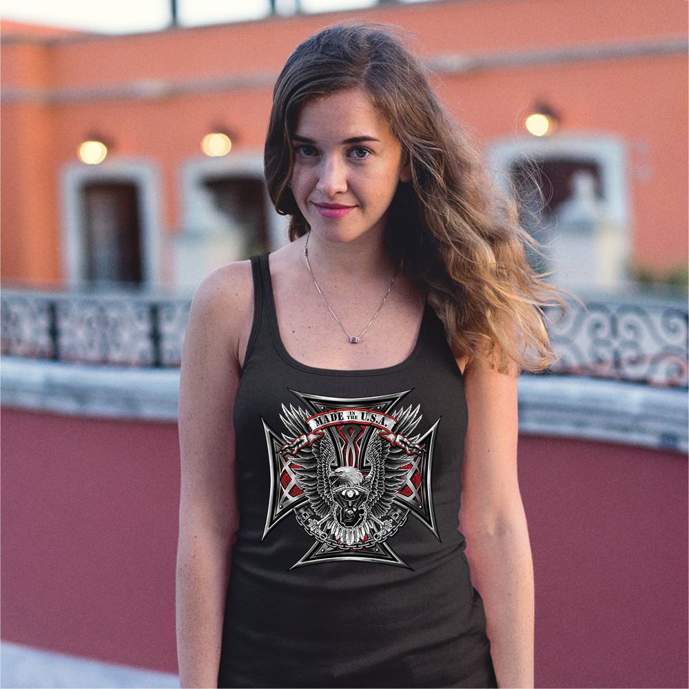 A print featuring a huge cross. In the front there is a bald eagle spreading it's wings and holding pistons in it's talons. In front of it's chest there is a V engine. At the top there is a stripe with "Made in the USA" written on it. A great choice for a