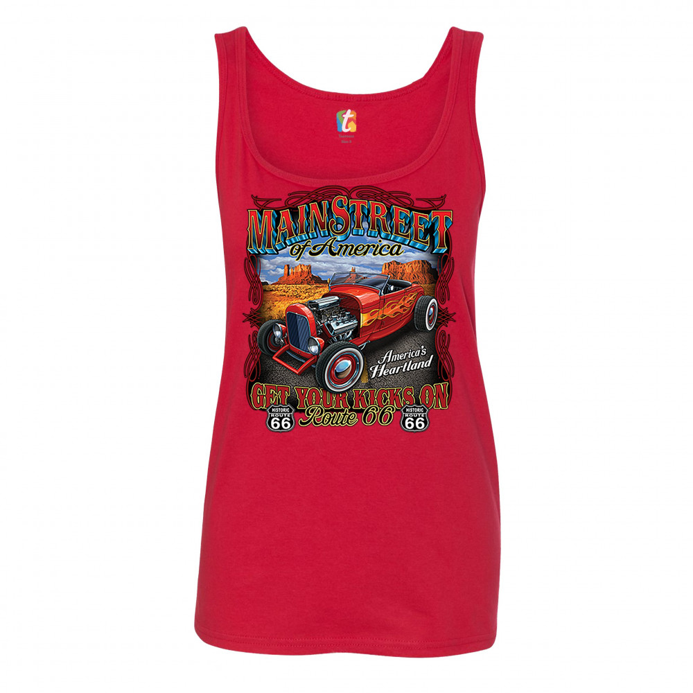 A print featuring a vintage hot rod with an exposed engine and flame paint job parked on a highway. The print says: "Main Street of America", "America's Heartland" and "Get Your Kicks on Route 66". The print also features two Route 66 signs. A great choic