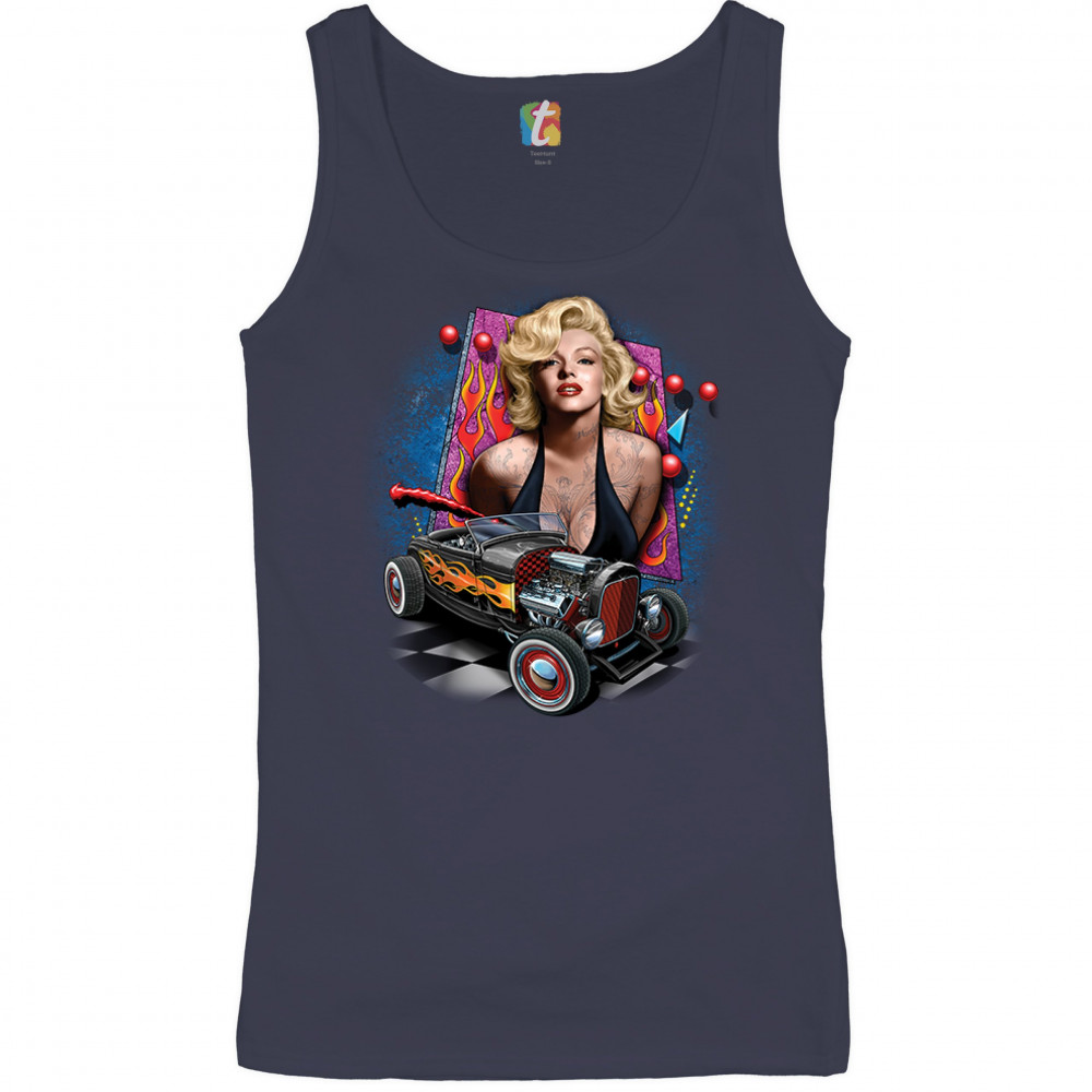 MARILYN MONROE HOT ROD women's tank top vintage route 66 drag racing navy blue