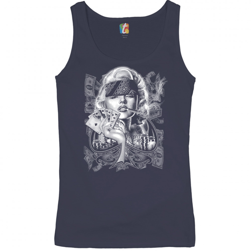 MARILYN MONROE PLAYING POKER SMOKING A JOINT women's tank top 420 marijuana navy blue