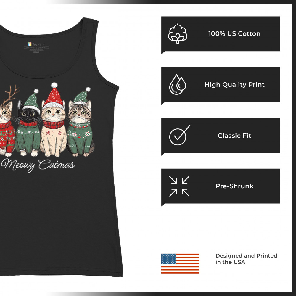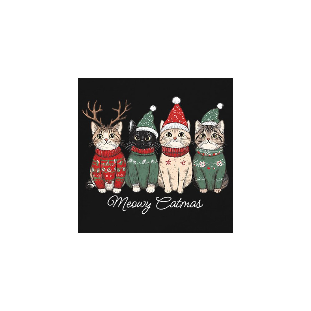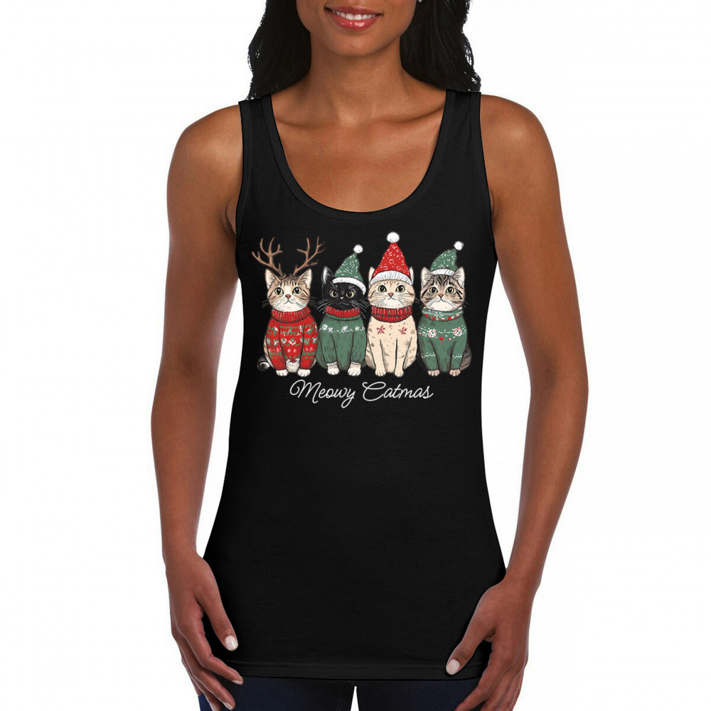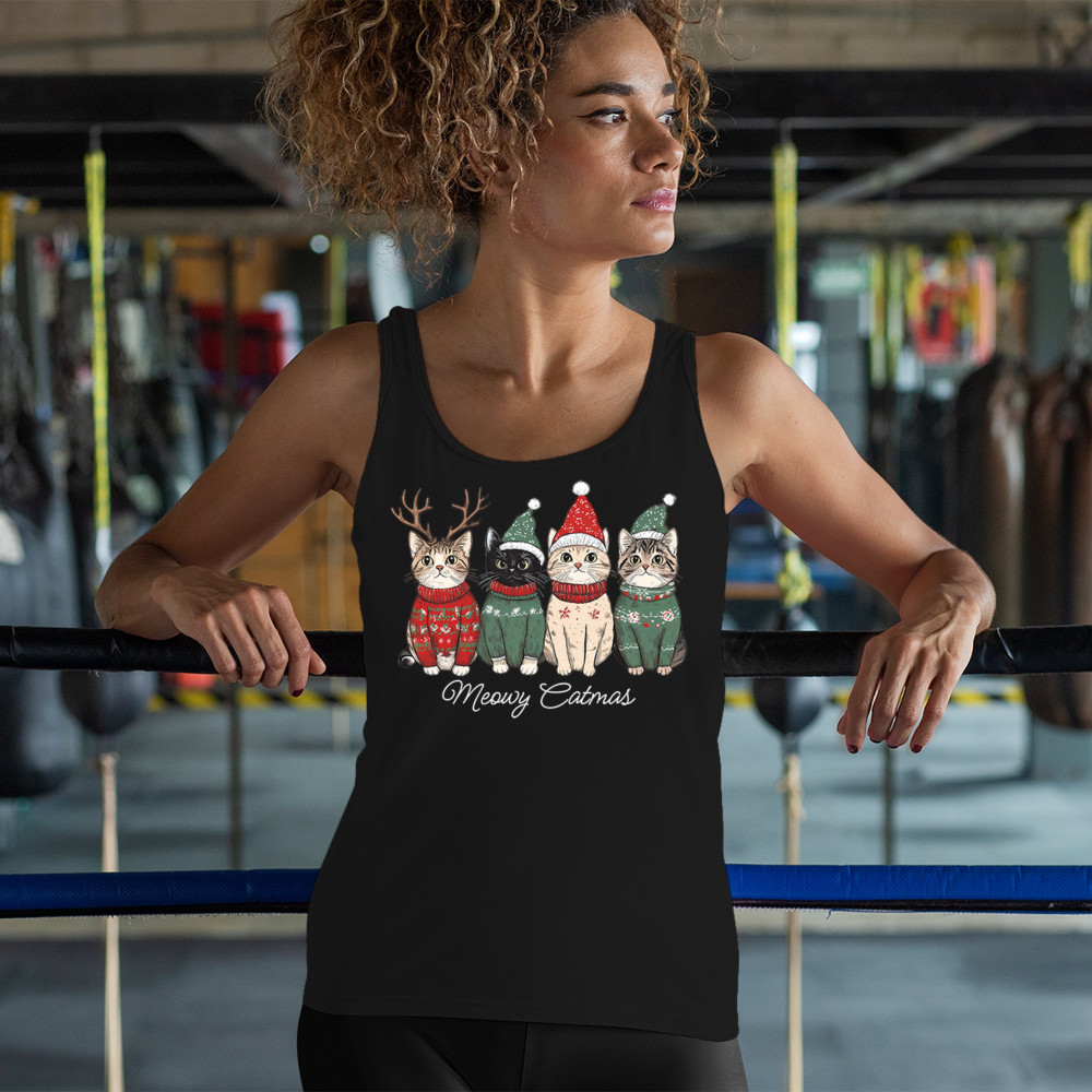 Cute Meowy Catmas design with festive kittens, perfect for cat lovers wanting a cozy holiday graphic and fun Christmas pet theme.