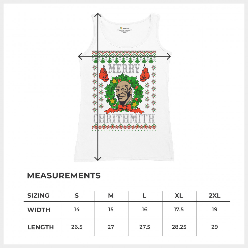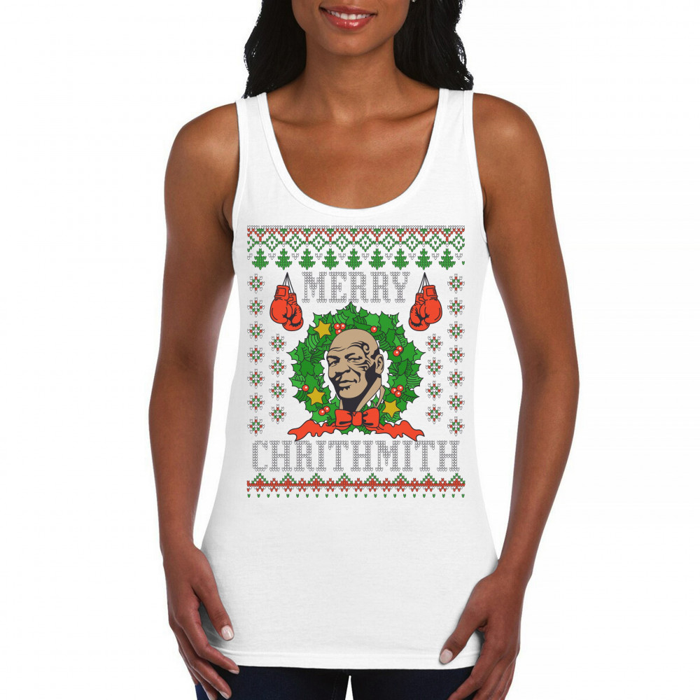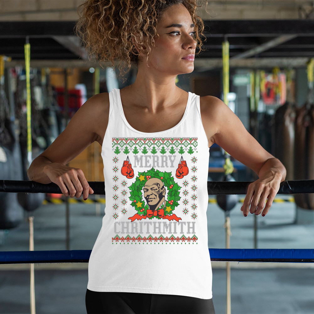 A print saying: "Merry Chrithmith" and featuring the face of Mike Tyson inside of a Christmas chaplet and two pairs of boxing gloves. The print is designed as an ugly sweater. Amazing choice to make people smile and spread positive vibes on Christmas Eve.