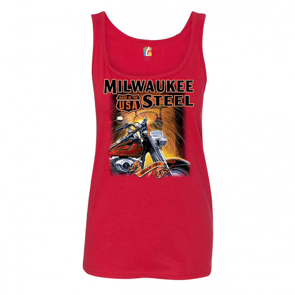 A print featuring a motorcycle in the front and a melting furnace in the background with sparkles flying all over the place. The print says: "Milwaukee Steel". There is also a sign that says "made in the USA" and a stripe with "since 1903" written on it.
