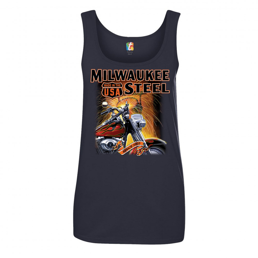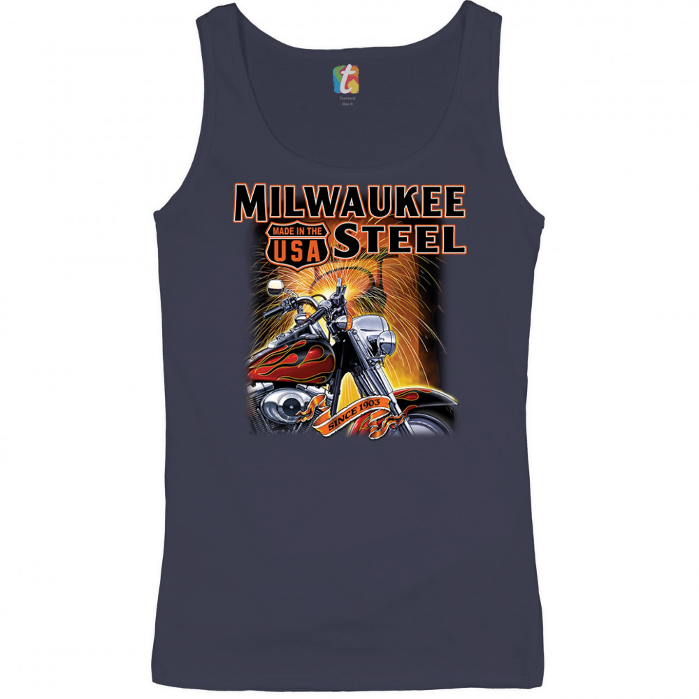 A print featuring a motorcycle in the front and a melting furnace in the background with sparkles flying all over the place. The print says: "Milwaukee Steel". There is also a sign that says "made in the USA" and a stripe with "since 1903" written on it.