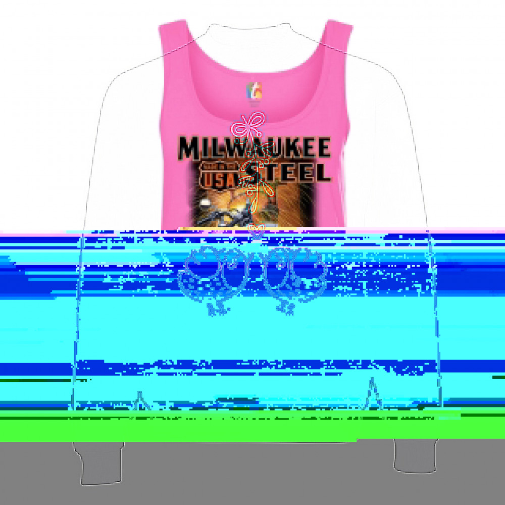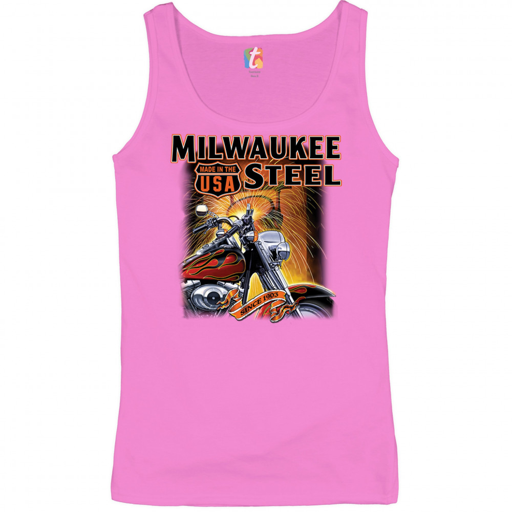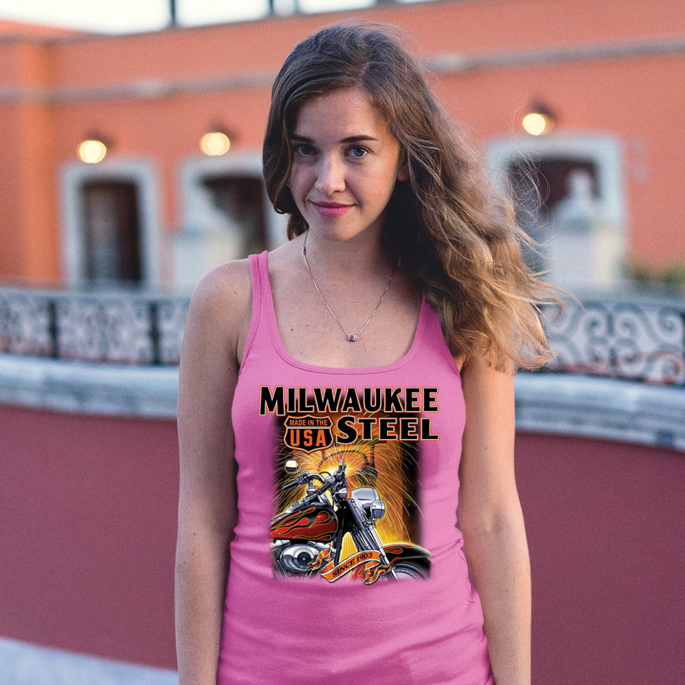A print featuring a motorcycle in the front and a melting furnace in the background with sparkles flying all over the place. The print says: "Milwaukee Steel". There is also a sign that says "made in the USA" and a stripe with "since 1903" written on it.