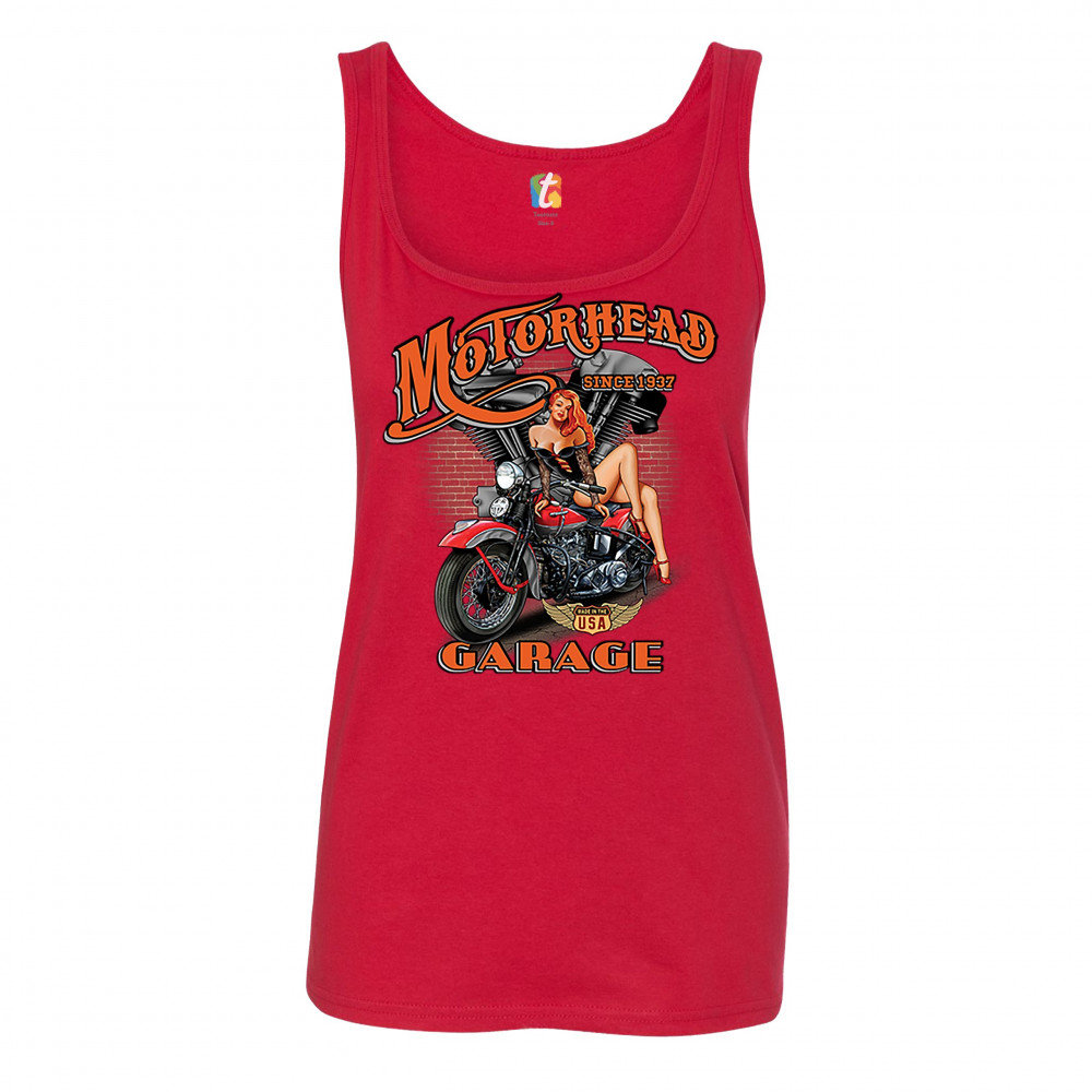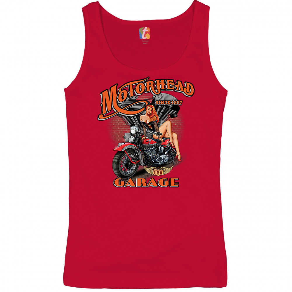 A print featuring a sexy pin-up girl sitting on a motorcycle. In the background there is a motorcycle engine and a brick wall. The print says: "Motorhead Garage since 1937" and features a "Made in the USA" sign. A great choice for a motorcycle enthusiast.