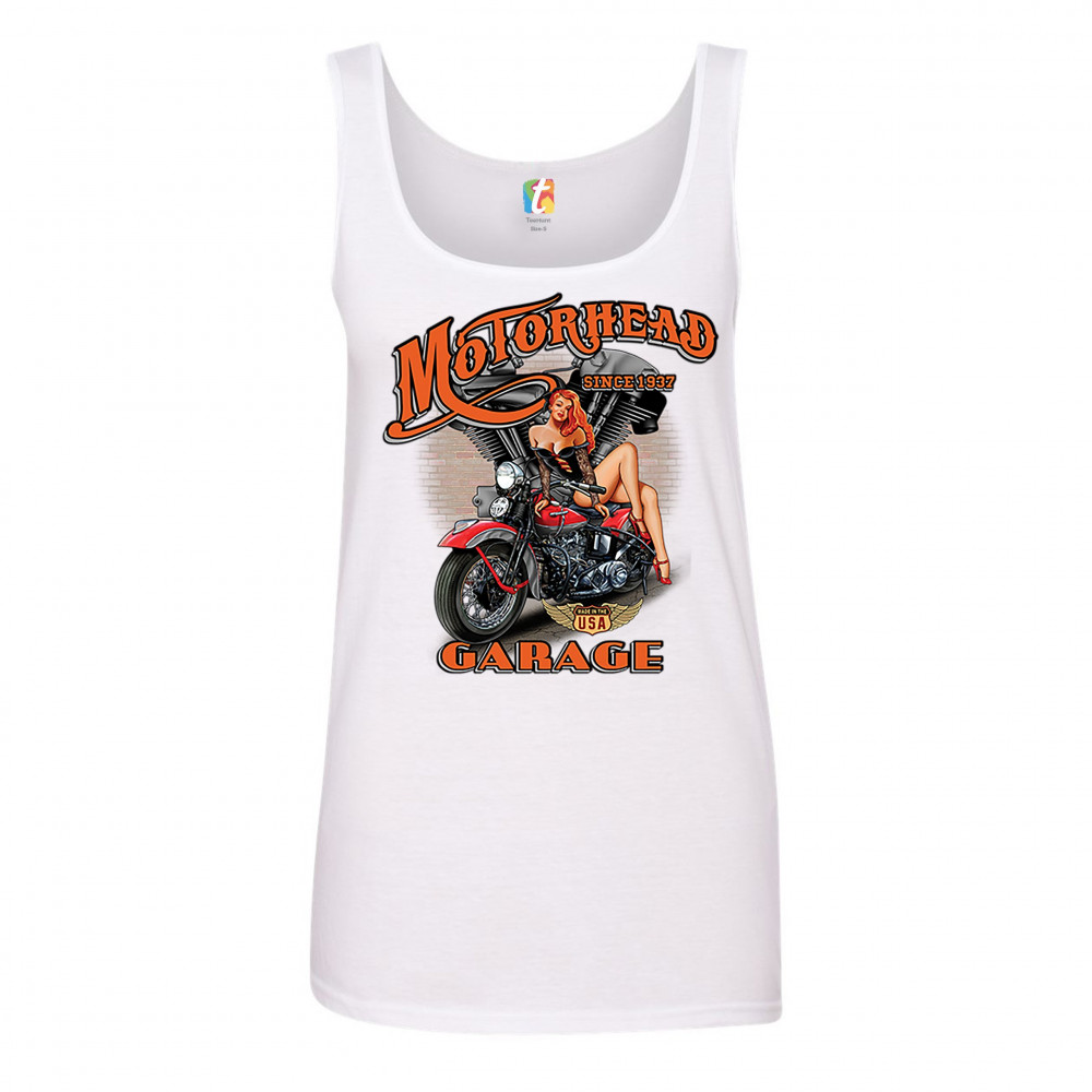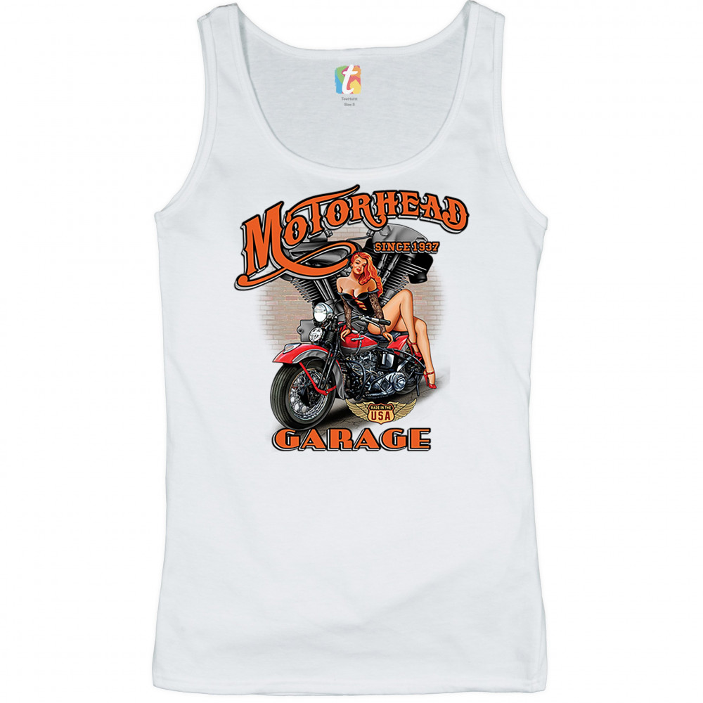 A print featuring a sexy pin-up girl sitting on a motorcycle. In the background there is a motorcycle engine and a brick wall. The print says: "Motorhead Garage since 1937" and features a "Made in the USA" sign. A great choice for a motorcycle enthusiast.
